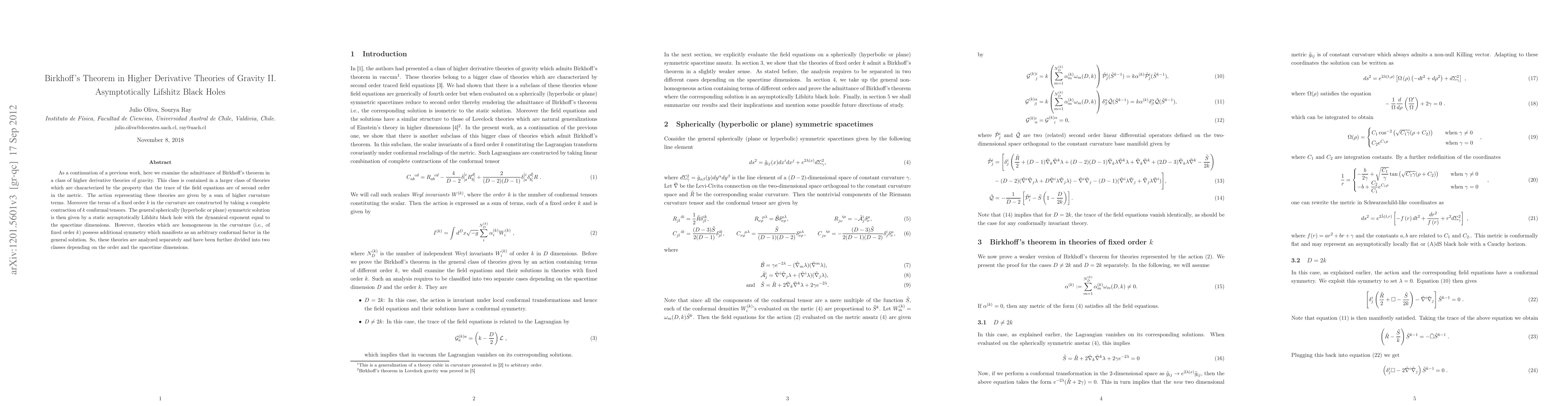This paper extends previous research to explore Birkhoff's theorem in higher derivative gravity theories, focusing on static asymptotically Lifshitz black holes. It identifies a class of theories with higher curvature terms and analyzes their solutions, revealing additional symmetries in homogeneous theories that allow for arbitrary conformal factors.