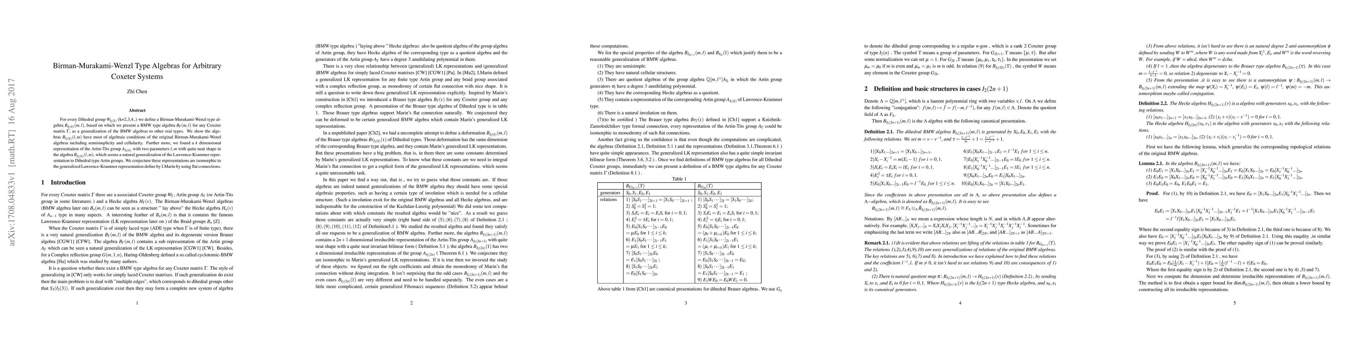 This paper constructs Birman-Murakami-Wenzl type algebras for rank 2 Coxeter systems (dihedral groups), proving their semisimplicity and classifying their irreducible representations, which generalize the Lawrence-Krammer representation. It extends these findings to arbitrary Coxeter systems, introducing a new algebra with properties analogous to the rank 2 case.