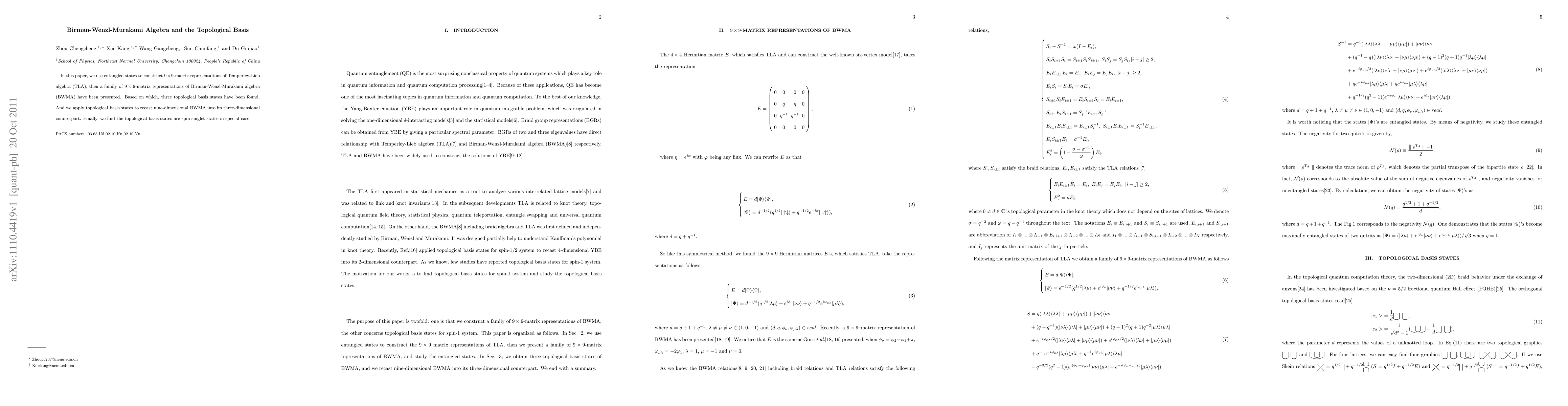 In this paper, we use entangled states to construct 9x9-matrix representations of Temperley-Lieb algebra (TLA), then a family of 9x9-matrix representations of Birman-Wenzl-Murakami algebra (BWMA) have been presented. Based on which, three topological basis states have been found. And we apply topological basis states to recast nine-dimensional BWMA into its three-dimensional counterpart. Finally, we find the topological basis states are spin singlet states in special case.