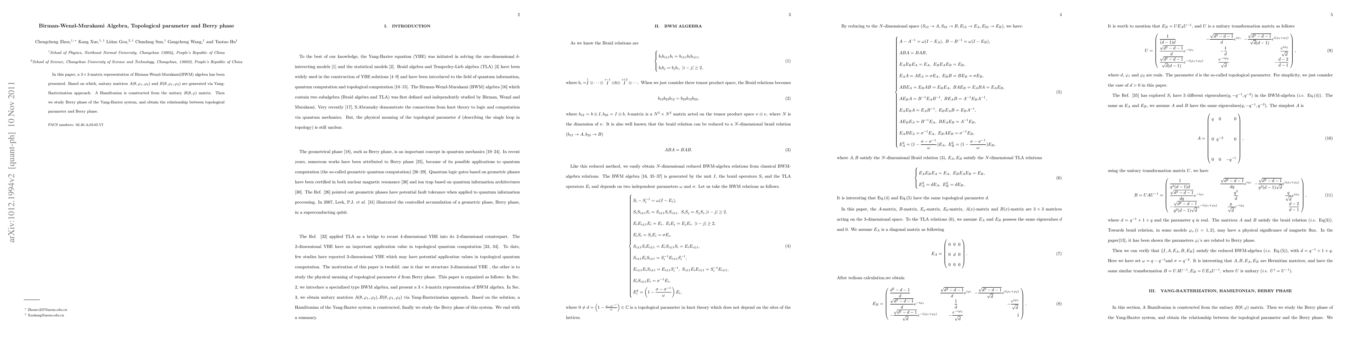 In this paper, a (3\times3)-matrix representation of the Birman-Wenzl-Murakami(BWM) algebra has been presented. Based on which, unitary matrices (A(\theta,\phi_1,\phi_2), B(\theta,\phi_1,\phi_2)) are generated via the Yang-Baxterization approach. A hamiltonian is constructed from the unitary (B(\theta,\phi)) matrix. We then study the Berry phase of the Yang-Baxter system and find the topological parameter d has relationship with berry phase.