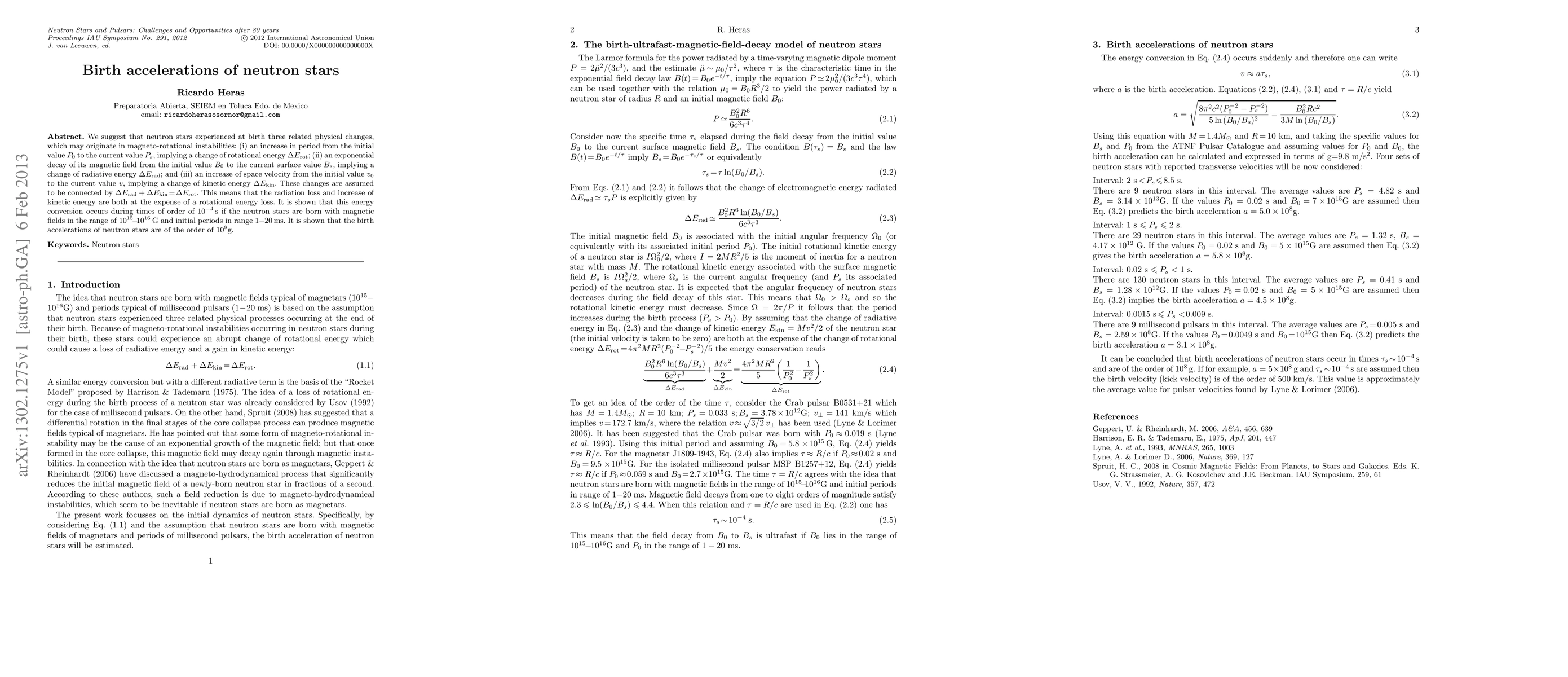 We suggest that neutron stars experienced at birth three related physical changes, which may originate in magneto-rotational instabilities: (i) an increase in period from the initial value P_0 to the current value P_s, implying a change of rotational energy \Delta E_rot; (ii) an exponential decay of its magnetic field from the initial value B_0 to the current surface value B_s, implying a change of radiative energy \Delta E_rad; and (iii) an increase of space velocity from the initial value v_0 to the current value v, implying a change of kinetic energy \Delta E_kin. These changes are assumed to be connected by \Delta E_rad + \Delta E_kin =\Delta E_rot. This means that the radiation loss and increase of kinetic energy are both at the expense of a rotational energy loss. It is shown that this energy conversion occurs during times of order of 10^(-4) s if the neutron stars are born with magnetic fields in the range of 10^(15)-10^(16) G and initial periods in range 1-20 ms. It is shown that the birth accelerations of neutron stars are of the order of 10^(8) g.