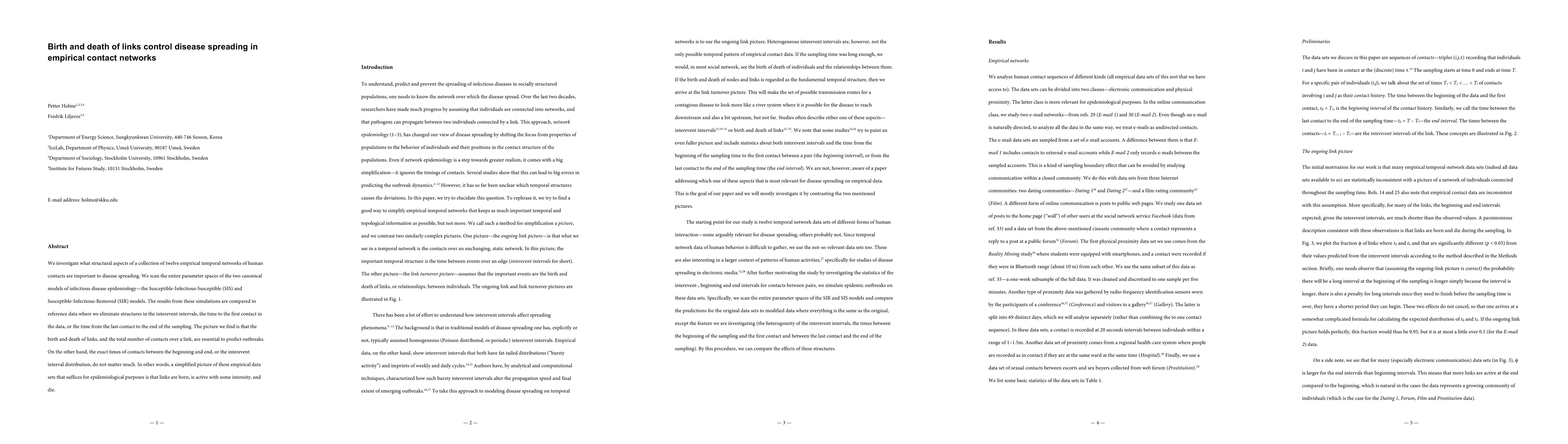 Researchers found that birth and death of links and total number of contacts over a link are crucial for predicting disease outbreaks in empirical contact networks. Simplifying data to focus on link activity with some intensity is sufficient for epidemiological purposes.