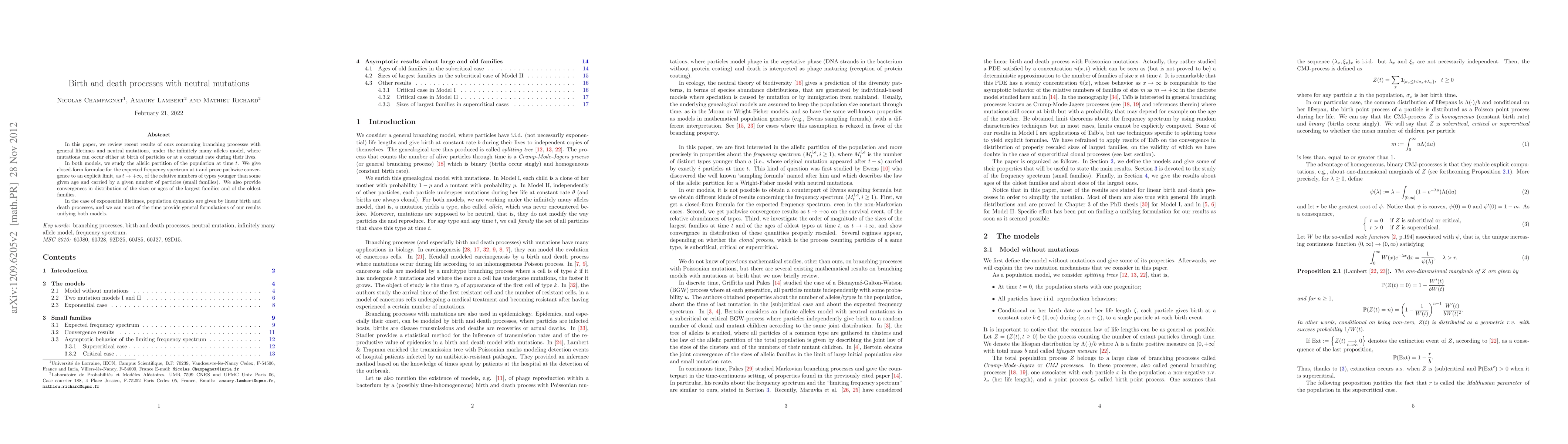 This paper reviews recent findings on branching processes with neutral mutations under the infinitely many alleles model, focusing on both birth-related and continuous lifetime mutations. It provides closed formulae for the expected frequency spectrum and proves pathwise convergence to a limit for the relative numbers of young types in small families, along with convergences in distribution for the sizes and ages of largest and oldest families.