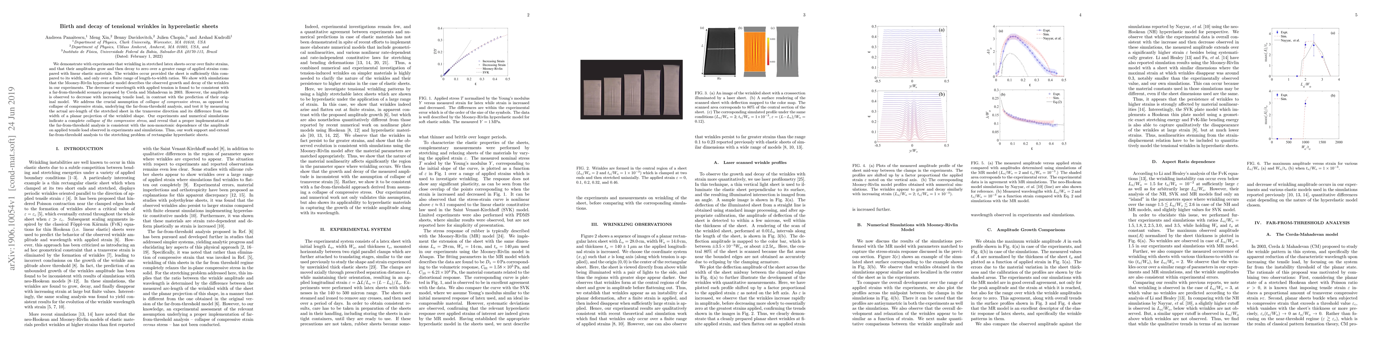 We demonstrate with experiments that wrinkling in stretched latex sheets occur over finite strains, and that their amplitudes grow and then decay to zero over a greater range of applied strains compared with linear elastic materials. The wrinkles occur provided the sheet is sufficiently thin compared to its width, and only over a finite range of length-to-width ratios. We show with simulations that the Mooney-Rivlin hyperelastic model describes the observed growth and decay of the wrinkles in our experiments. The decrease of wavelength with applied tension is found to be consistent with a far-from-threshold scenario proposed by Cerda and Mahadevan in 2003. However, the amplitude is observed to decrease with increasing tensile load, in contrast with the prediction of their original model. We address the crucial assumption of {\it collapse of compressive stress}, as opposed to collapse of compressive strain, underlying the far-from-threshold analysis, and test it by measuring the actual arc-length of the stretched sheet in the transverse direction and its difference from the width of a planar projection of the wrinkled shape. Our experiments and numerical simulations indicate a complete {\it collapse of the compressive stress}, and reveal that a proper implementation of the far-from-threshold analysis is consistent with the non-monotonic dependence of the amplitude on applied tensile load observed in experiments and simulations. Thus, our work support and extend far-from-threshold analysis to the stretching problem of rectangular hyperelastic sheets.