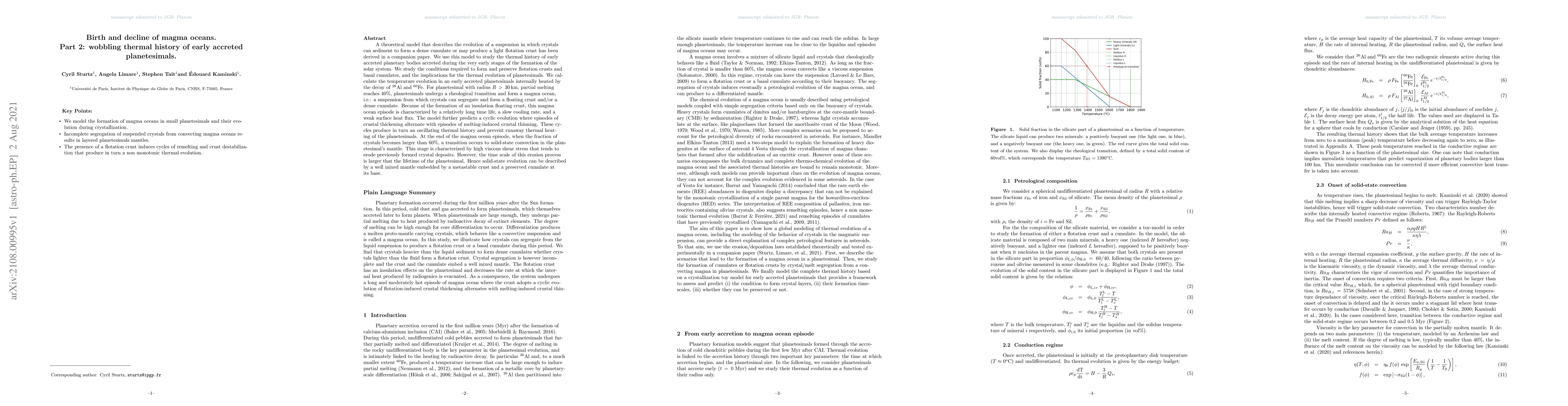 A theoretical model that describes the evolution of a suspension in which crystals can sediment to form a dense cumulate or may produce a light flotation crust has been derived in a companion paper. We use this model to study the thermal history of early accreted planetary bodies accreted during the very early stages of the formation of the solar system. We study the conditions required to form and preserve flotation crusts and basal cumulates, and the implications for the thermal evolution of planetesimals. We calculate the temperature evolution in an early accreted planetesimals internally heated by the decay of $\rm{^{26}Al}$ and $\rm{^{60}Fe}$. For planetesimal with radius $R>30\, \rm{km}$, partial melting reaches 40%, planetesimals undergo a rheological transition and form a magma ocean, i.e.: a suspension from which crystals can segregate and form a floating crust and/or a dense cumulate. Because of the formation of an insulation floating crust, this magma ocean episode is characterized by a relatively long time life, a slow cooling rate, and a weak surface heat flux. The model further predicts a cyclic evolution where episodes of crustal thickening alternate with episodes of melting-induced crustal thinning. These cycles produce in turn an oscillating thermal history and prevent runaway thermal heating of the planetesimals. At the end of the magma ocean episode, when the fraction of crystals becomes larger than 60\%, a transition occurs to solid-state convection in the planetesimal's mantle. This stage is characterized by high viscous shear stress that tends to erode previously formed crystal deposits. However, the time scale of this erosion process is larger that the lifetime of the planetesimal. Hence solid-state evolution can be described by a well mixed mantle embedded by a metastable crust and a preserved cumulate at its base.