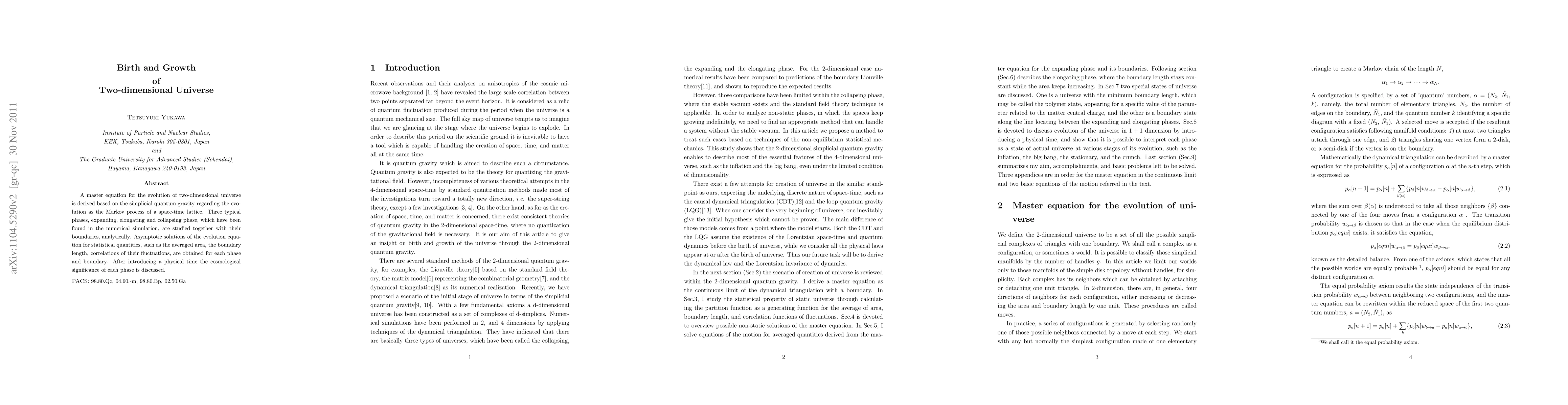 A master equation for the evolution of two-dimensional universe is derived based on the simplicial quantum gravity regarding the evolution as the Markov process of a space-time lattice. Three typical phases, expanding, elongating and collapsing phase, which have been found in the numerical simulation, are studied together with their boundaries, analytically. Asymptotic solutions of the evolution equation for statistical quantities, such as averaged area, boundary length, and correlation of fluctuations, are obtained for each phase and boundary.After introducing a physical time the cosmological significance of each phase is discussed.