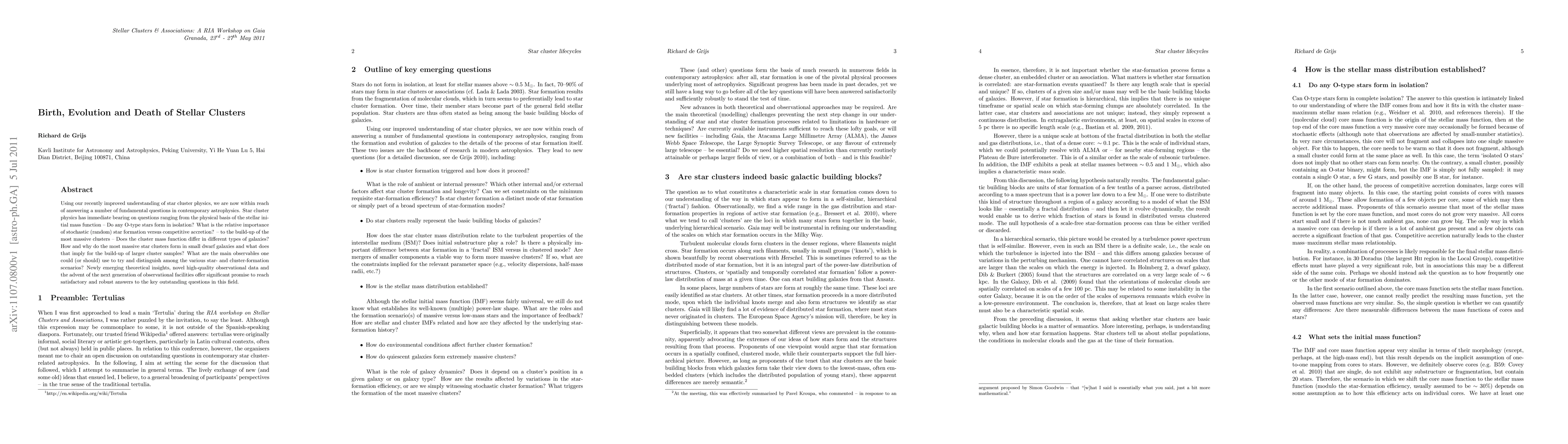 Using our recently improved understanding of star cluster physics, we are now within reach of answering a number of fundamental questions in contemporary astrophysics. Star cluster physics has immediate bearing on questions ranging from the physical basis of the stellar initial mass function - Do any O-type stars form in isolation? What is the relative importance of stochastic (random) star formation versus competitive accretion? - to the build-up of the most massive clusters - Does the cluster mass function differ in different types of galaxies? How and why do the most massive star clusters form in small dwarf galaxies and what does that imply for the build-up of larger cluster samples? What are the main observables one could (or should) use to try and distinguish among the various star- and cluster-formation scenarios? Newly emerging theoretical insights, novel high-quality observational data and the advent of the next generation of observational facilities offer significant promise to reach satisfactory and robust answers to the key outstanding questions in this field.