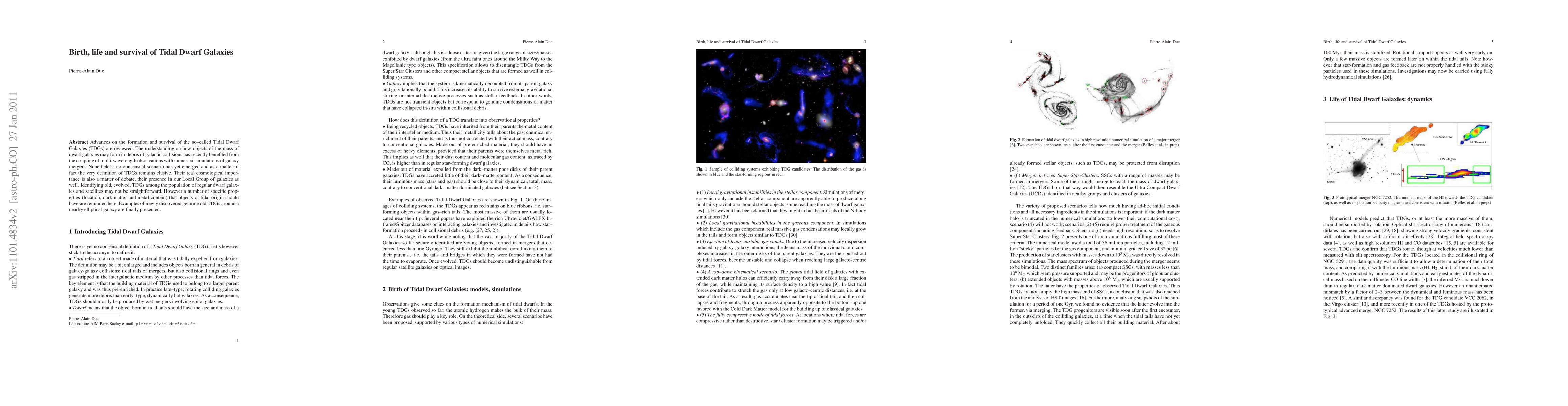 This paper reviews the formation and survival of Tidal Dwarf Galaxies (TDGs), emphasizing the recent advances in understanding their origin from galactic collisions. Despite progress, the exact nature and definition of TDGs remain unclear, and their cosmological significance is debated; however, specific properties like location, dark matter, and metal content help identify them, with examples of old TDGs around a nearby elliptical galaxy provided.