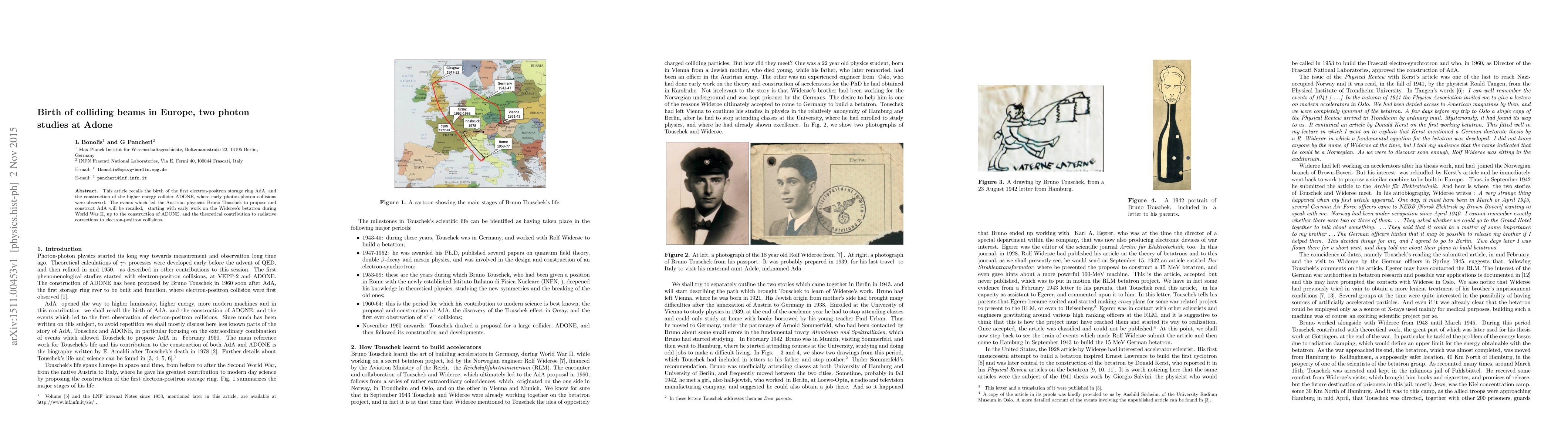 The paper commemorates the establishment of AdA, Europe's first electron-positron storage ring, and the development of ADONE, a higher-energy collider. It highlights Bruno Touschek's pivotal role, from his early betatron work during WWII to his theoretical contributions on radiative corrections in electron-positron collisions.