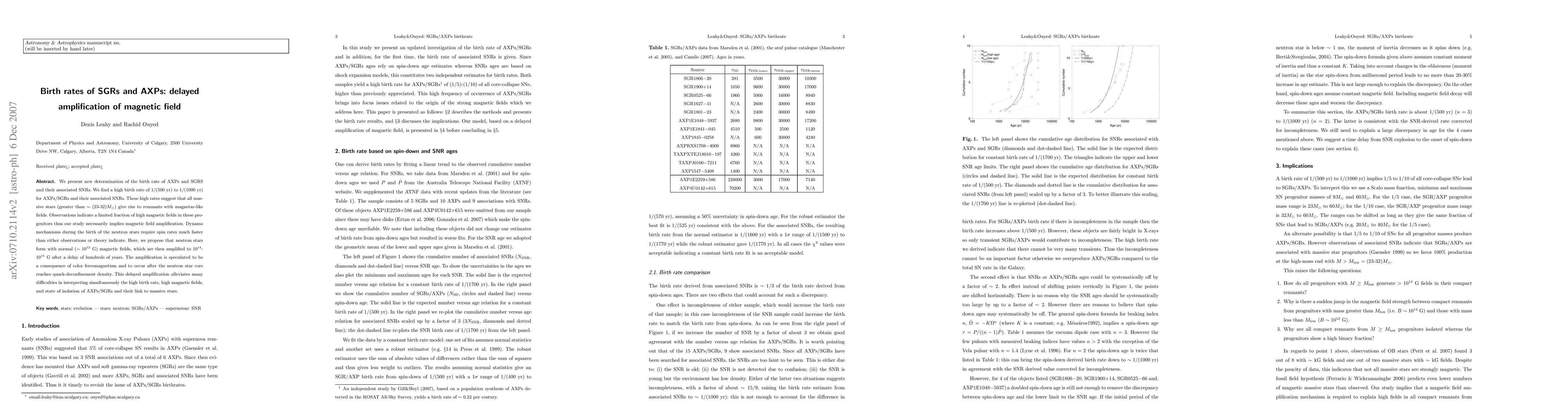 This paper determines high birth rates for AXPs/SGRs and their associated SNRs, proposing that their strong magnetic fields are amplified after a delay of several hundred years through color ferromagnetism, rather than being present at birth. This delayed amplification resolves issues linking high birth rates and magnetic fields to massive stars.