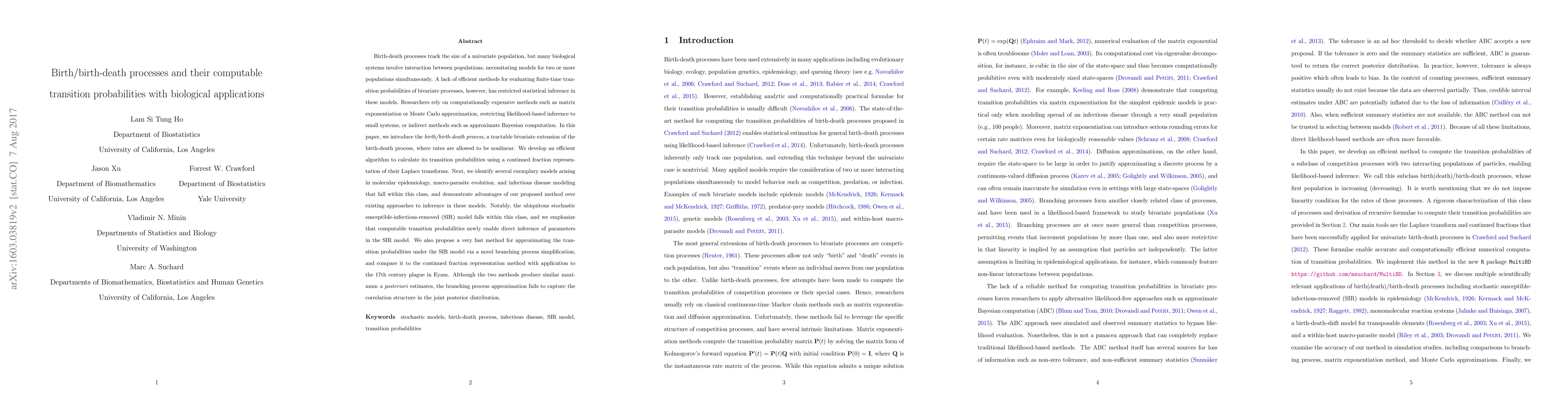 Birth-death processes track the size of a univariate population, but many biological systems involve interaction between populations, necessitating models for two or more populations simultaneously. A lack of efficient methods for evaluating finite-time transition probabilities of bivariate processes, however, has restricted statistical inference in these models. Researchers rely on computationally expensive methods such as matrix exponentiation or Monte Carlo approximation, restricting likelihood-based inference to small systems, or indirect methods such as approximate Bayesian computation. In this paper, we introduce the birth(death)/birth-death process, a tractable bivariate extension of the birth-death process. We develop an efficient and robust algorithm to calculate the transition probabilities of birth(death)/birth-death processes using a continued fraction representation of their Laplace transforms. Next, we identify several exemplary models arising in molecular epidemiology, macro-parasite evolution, and infectious disease modeling that fall within this class, and demonstrate advantages of our proposed method over existing approaches to inference in these models. Notably, the ubiquitous stochastic susceptible-infectious-removed (SIR) model falls within this class, and we emphasize that computable transition probabilities newly enable direct inference of parameters in the SIR model. We also propose a very fast method for approximating the transition probabilities under the SIR model via a novel branching process simplification, and compare it to the continued fraction representation method with application to the 17th century plague in Eyam. Although the two methods produce similar maximum a posteriori estimates, the branching process approximation fails to capture the correlation structure in the joint posterior distribution.