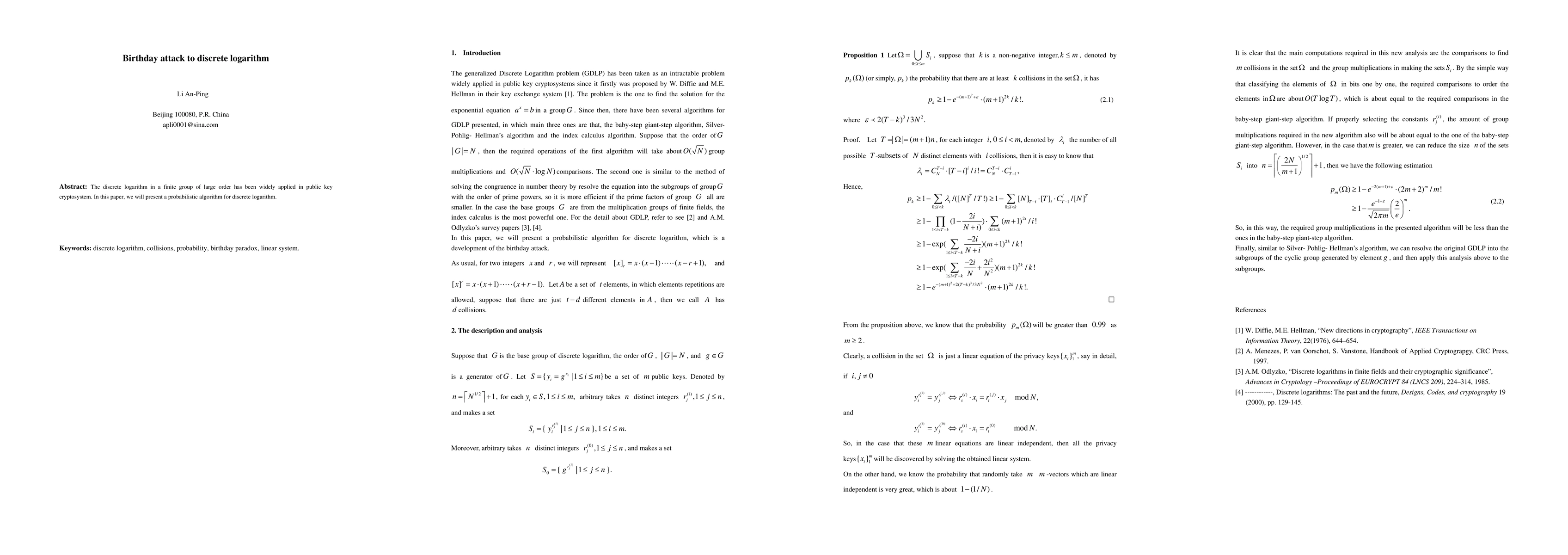 Summary: This paper introduces a probabilistic algorithm to solve the discrete logarithm problem, which is fundamental in public key cryptosystems, and discusses its implications for cryptographic security. The method aims to enhance the efficiency of solving such problems in large finite groups.