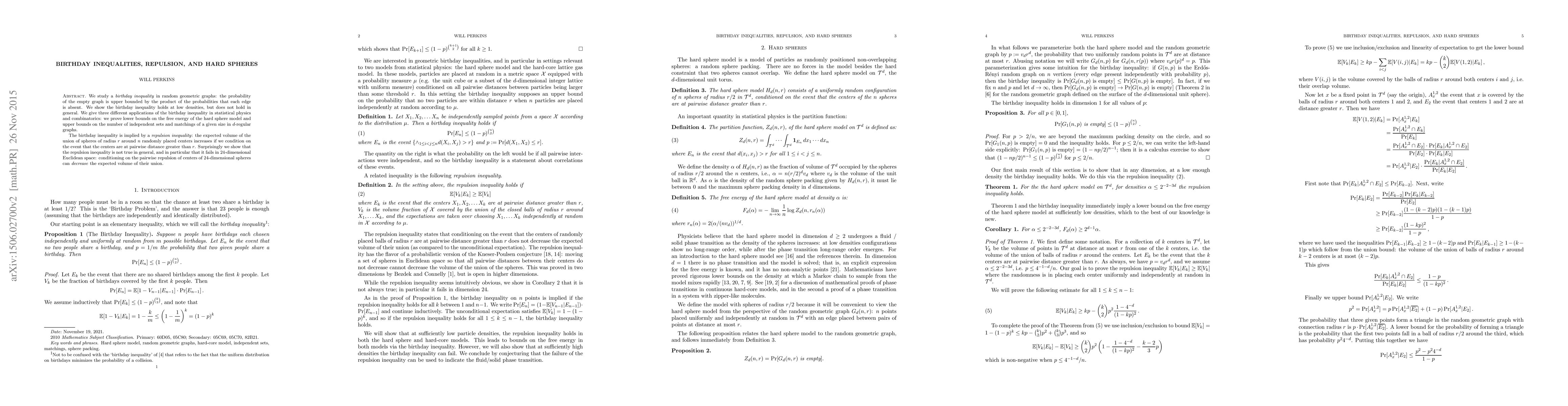 We study a birthday inequality in random geometric graphs: the probability of the empty graph is upper bounded by the product of the probabilities that each edge is absent. We show the birthday inequality holds at low densities, but does not hold in general. We give three different applications of the birthday inequality in statistical physics and combinatorics: we prove lower bounds on the free energy of the hard sphere model and upper bounds on the number of independent sets and matchings of a given size in d-regular graphs. The birthday inequality is implied by a repulsion inequality: the expected volume of the union of spheres of radius r around n randomly placed centers increases if we condition on the event that the centers are at pairwise distance greater than r. Surprisingly we show that the repulsion inequality is not true in general, and in particular that it fails in 24-dimensional Euclidean space: conditioning on the pairwise repulsion of centers of 24-dimensional spheres can decrease the expected volume of their union.