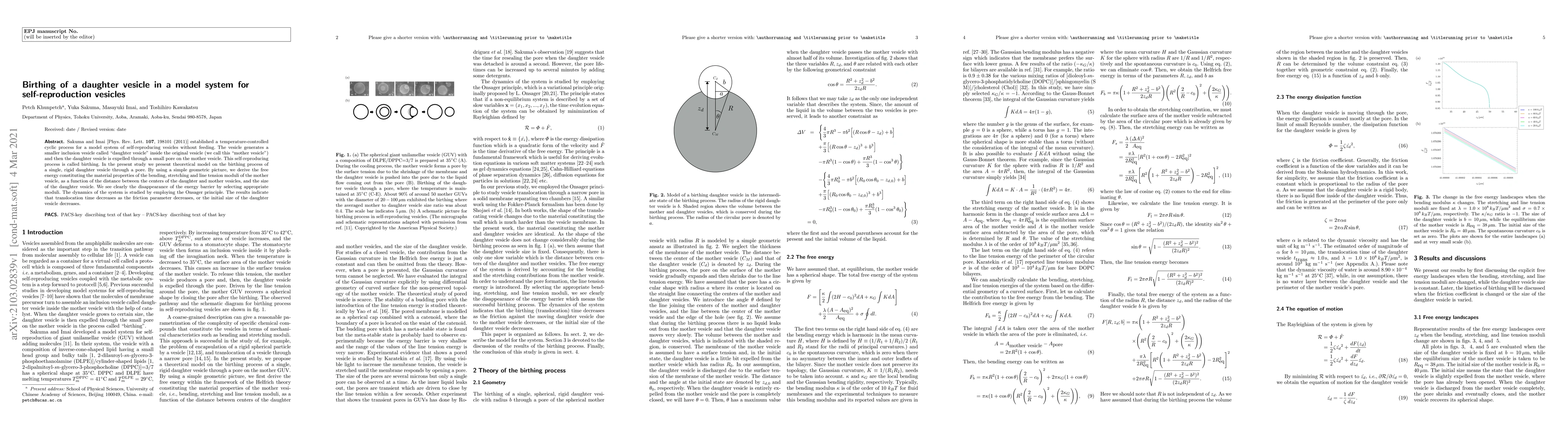 Sakuma and Imai [Phys. Rev. Lett. 107, 198101 (2011)] established a temperature-controlled cyclic process for a model system of self-reproducing vesicles without feeding. The vesicle generates a smaller inclusion vesicle called "daughter vesicle" inside the original vesicle (we call this "mother vesicle") and then the daughter vesicle is expelled through a small pore on the mother vesicle. This self-reproducing process is called birthing. In the present study we present theoretical model on the birthing process of a single, rigid daughter vesicle through a pore. By using a simple geometric picture, we derive the free energy constituting the material properties of the bending, stretching and line tension moduli of the mother vesicle, as a function of the distance between the centers of the daughter and mother vesicles, and the size of the daughter vesicle. We see clearly the disappearance of the energy barrier by selecting appropriate moduli. The dynamics of the system is studied by employing the Onsager principle. The results indicate that translocation time decreases as the friction parameter decreases, or the initial size of the daughter vesicle decreases.