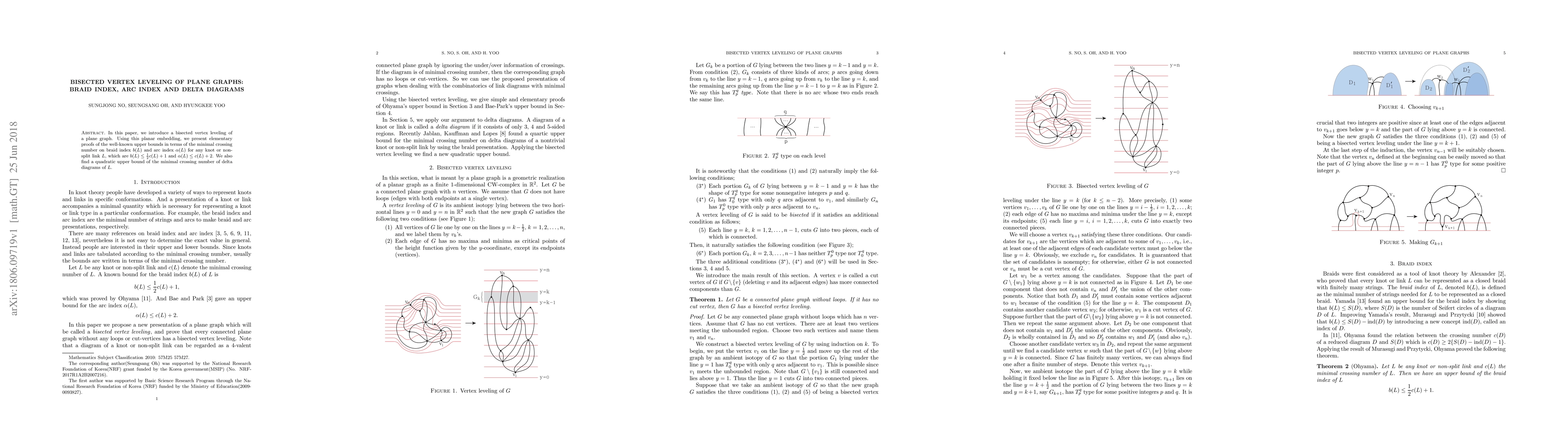 This paper introduces a bisected vertex leveling technique for plane graphs, providing elementary proofs for upper bounds on the braid and arc indices of knots and links, and establishing a quadratic upper bound for the minimal crossing number of delta diagrams.