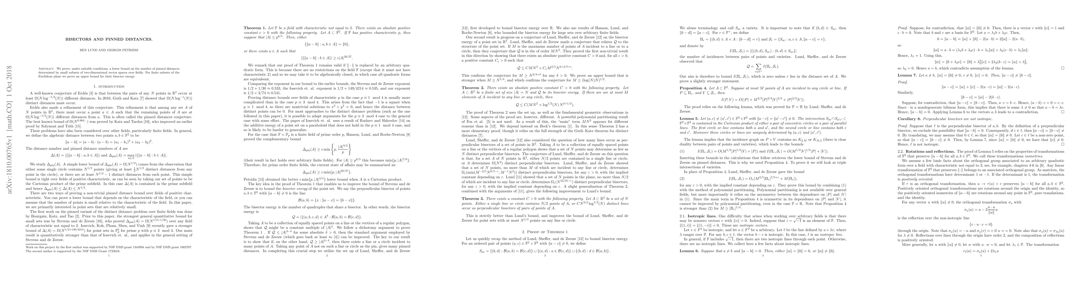 Summary: This paper establishes a lower bound on the number of pinned distances for small subsets in two-dimensional vector spaces under certain conditions. It also provides an upper bound for the bisector energy of finite subsets in the Euclidean plane.