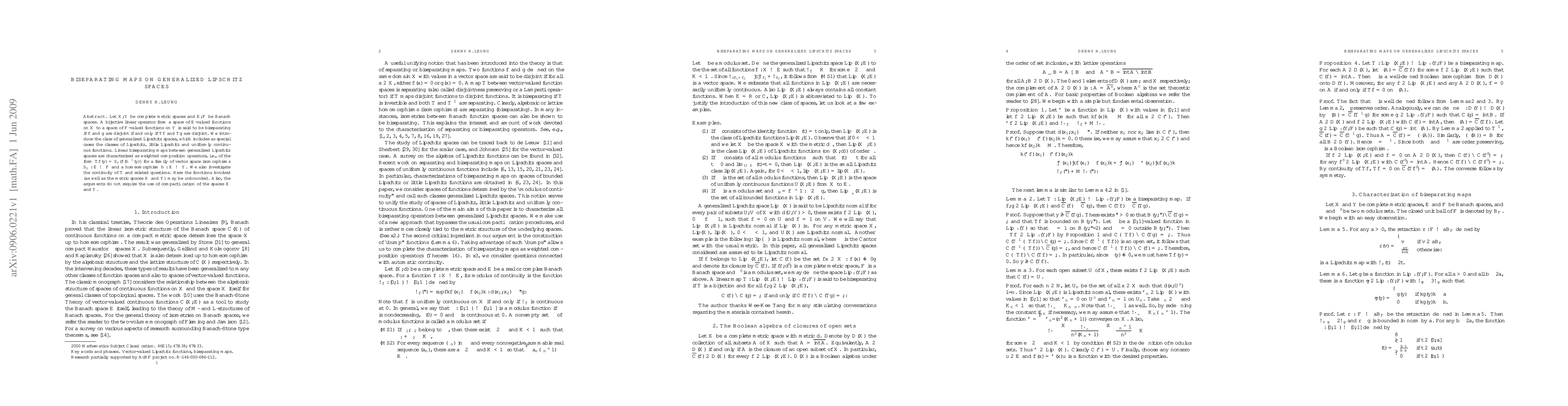 Let $X, Y$ be complete metric spaces and $E, F$ be Banach spaces. A bijective linear operator from a space of $E$-valued functions on $X$ to a space of $F$-valued functions on $Y$ is said to be biseparating if $f$ and $g$ are disjoint if and only if $Tf$ and $Tg$ are disjoint. We introduce the class of generalized Lipschitz spaces, which includes as special cases the classes of Lipschitz, little Lipschitz and uniformly continuous functions. Linear biseparating maps between generalized Lipschitz spaces are characterized as weighted composition operators, i.e., of the form $Tf(y) = S_y(f(h^{-1}(y))$ for a family of vector space isomorphisms $S_y: E \to F$ and a homeomorphism $h : X\to Y$. We also investigate the continuity of $T$ and related questions. Here the functions involved (as well as the metric spaces $X$ and $Y$) may be unbounded. Also, the arguments do not require the use of compactification of the spaces $X$ and $Y$.