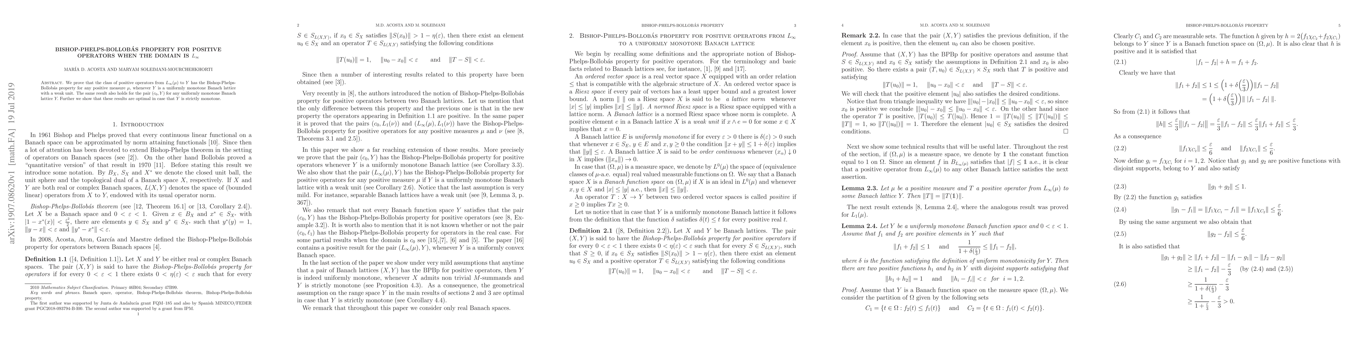 Summary: The paper proves the Bishop-Phelps-Bollobás property for positive operators from $L_\infty (\mu)$ to uniformly monotone Banach lattices $Y$ with a weak unit, and extends this to the pair $(c_0, Y)$. The results are shown to be optimal when $Y$ is strictly monotone.