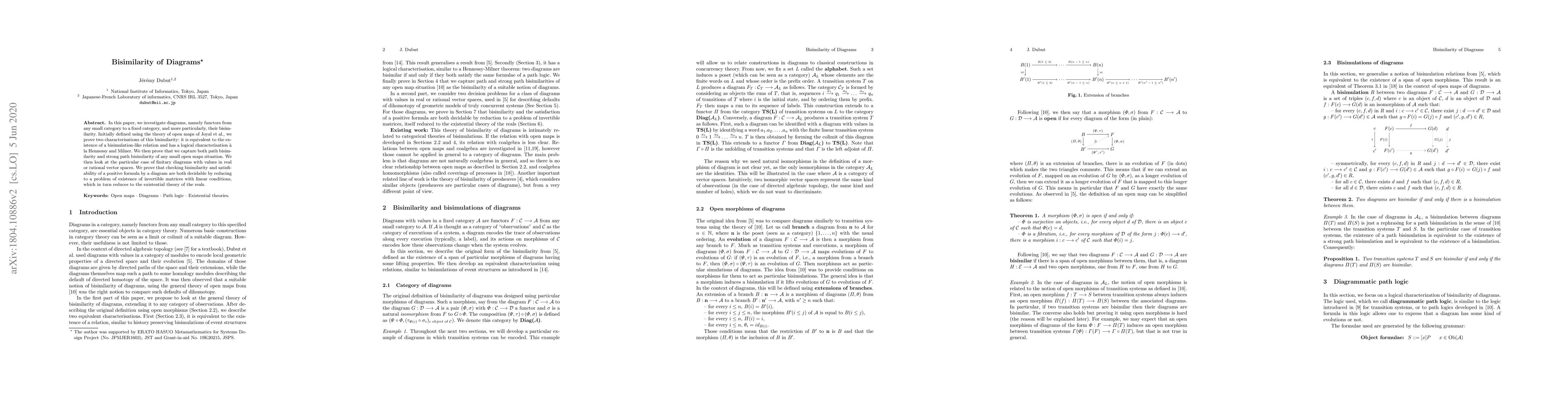 In this paper, we investigate diagrams, namely functors from any small category to a fixed category, and more particularly, their bisimilarity. Initially defined using the theory of open maps of Joyal et al., we prove several equivalent characterizations: it is equivalent to the existence of a relation, similar to history-preserving bisimulations for event structures and it has a logical characterization similar to the Hennessy-Milner theorem. We then prove that we capture many different known bismilarities, by considering the category of executions and extensions of executions, and by forming the functor that maps every execution to the information of interest for the problem at hand. We then look at the particular case of finitary diagrams with values in real or rational vector spaces. We prove that checking bisimilarity and satisfiability of a positive formula by a diagram are both decidable by reducing to a problem of existence of invertible matrices with linear conditions, which in turn reduces to the existential theory of the reals.