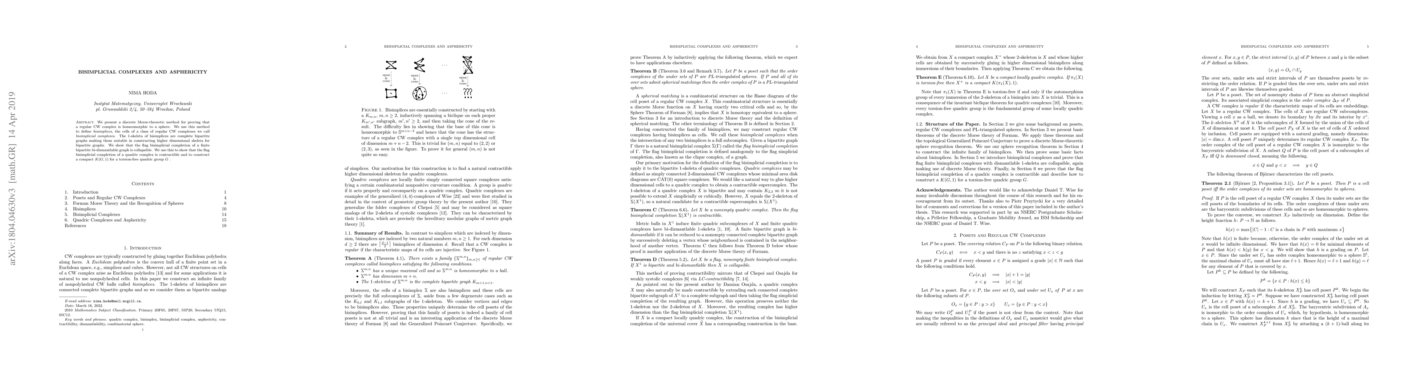 This paper introduces a discrete Morse theory for proving that certain regular CW complexes are homeomorphic to spheres, defining bisimplices and bisimplicial complexes. It demonstrates the collapsible nature of flag bisimplicial completions of bipartite graphs, leading to the contractibility of quadric complexes and the construction of compact K(G,1) spaces for torsion-free quadric groups.