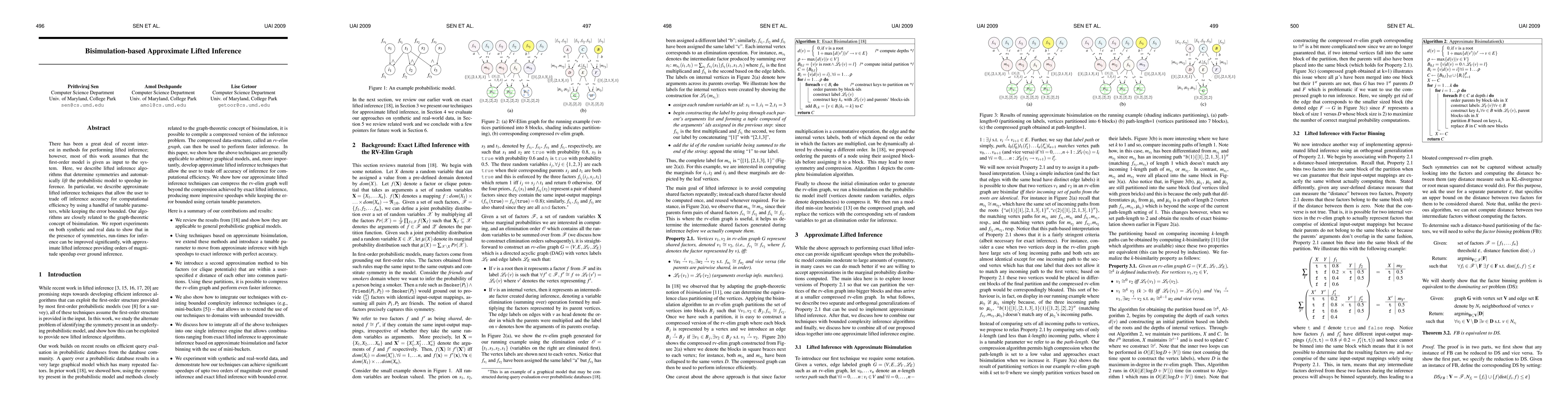 The paper describes lifted inference algorithms that automatically determine symmetries and lift probabilistic models to speed up inference, using bisimulation concepts and tunable parameters to trade off accuracy for computational efficiency.