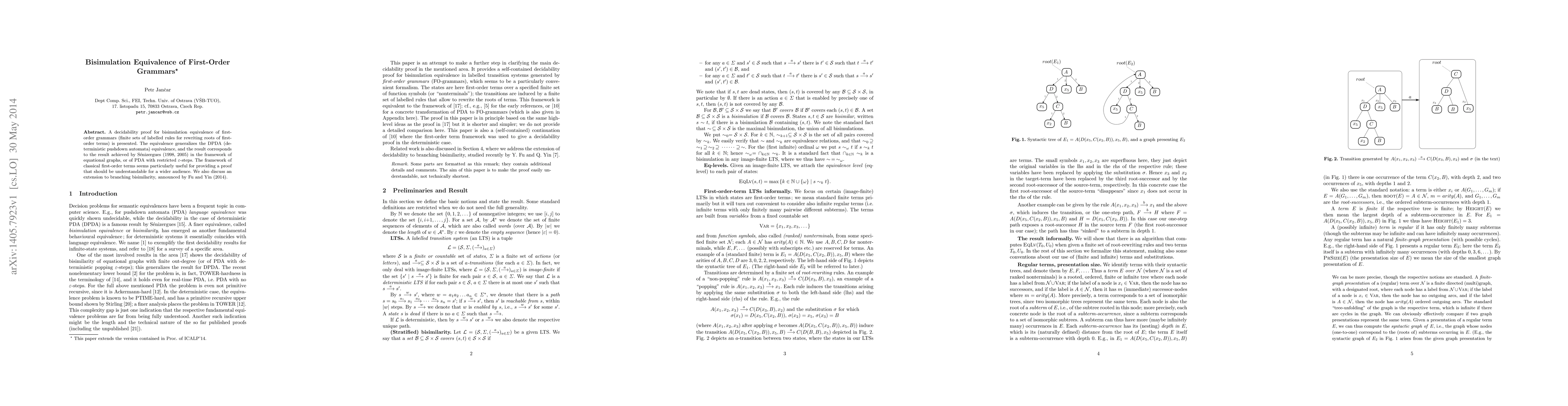 The paper contributes a decidability proof for bisimulation equivalence of first-order grammars, extending the framework to include branching bisimilarity.