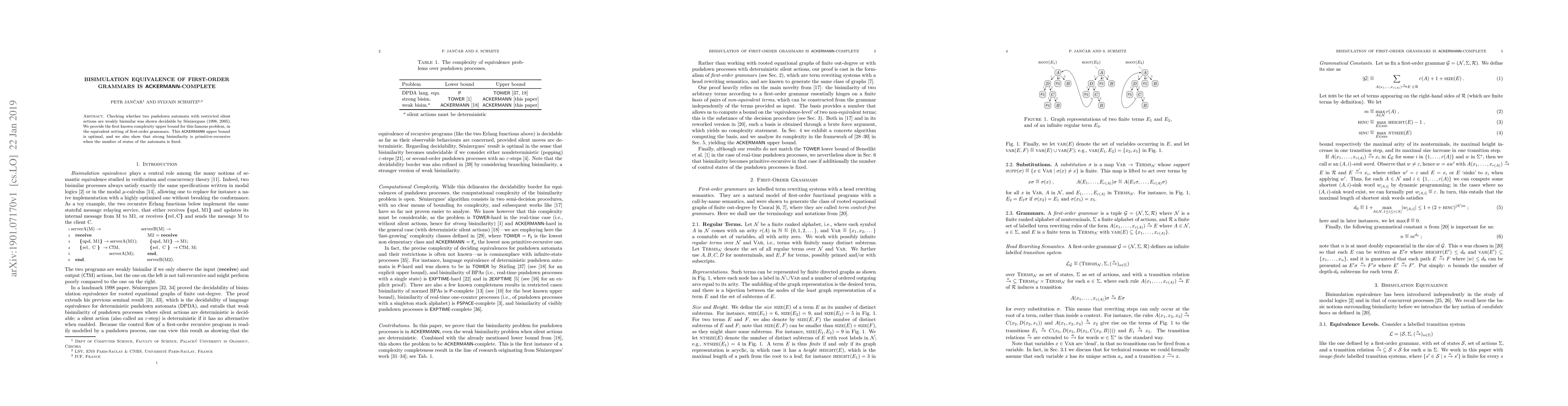 Checking whether two pushdown automata with restricted silent actions are weakly bisimilar was shown decidable by S\'enizergues (1998, 2005). We provide the first known complexity upper bound for this famous problem, in the equivalent setting of first-order grammars. This ACKERMANN upper bound is optimal, and we also show that strong bisimilarity is primitive-recursive when the number of states of the automata is fixed.
