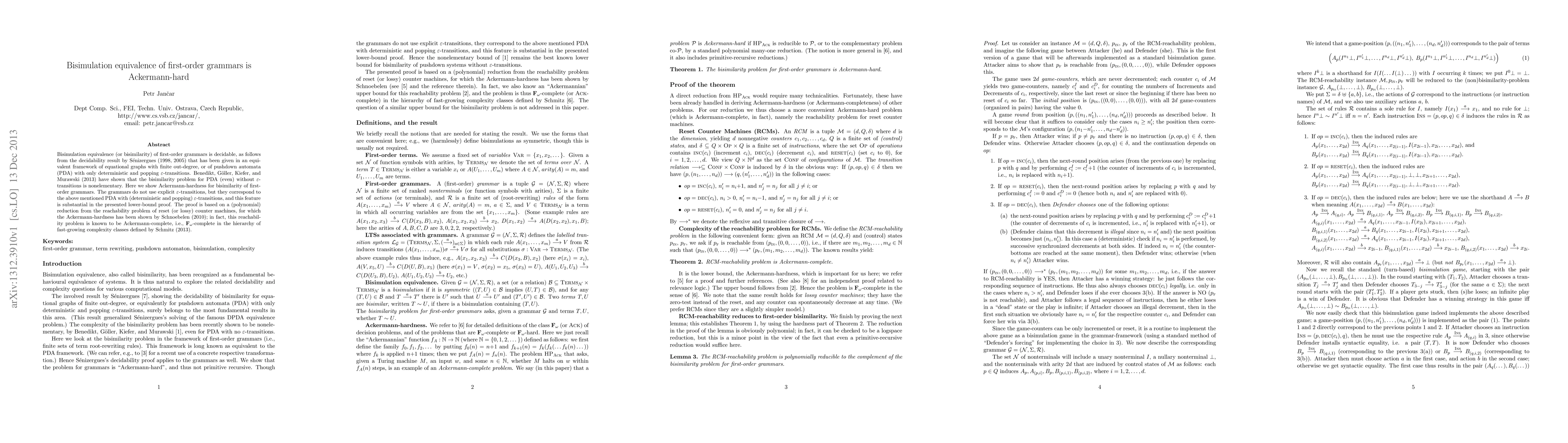 This paper establishes that bisimulation equivalence of first-order grammars is Ackermann-hard, demonstrating a lower-bound proof through a polynomial reduction from the reachability problem of reset counter machines. The complexity of this problem is shown to be substantial due to the correspondence with pushdown automata featuring deterministic and popping epsilon-transitions.