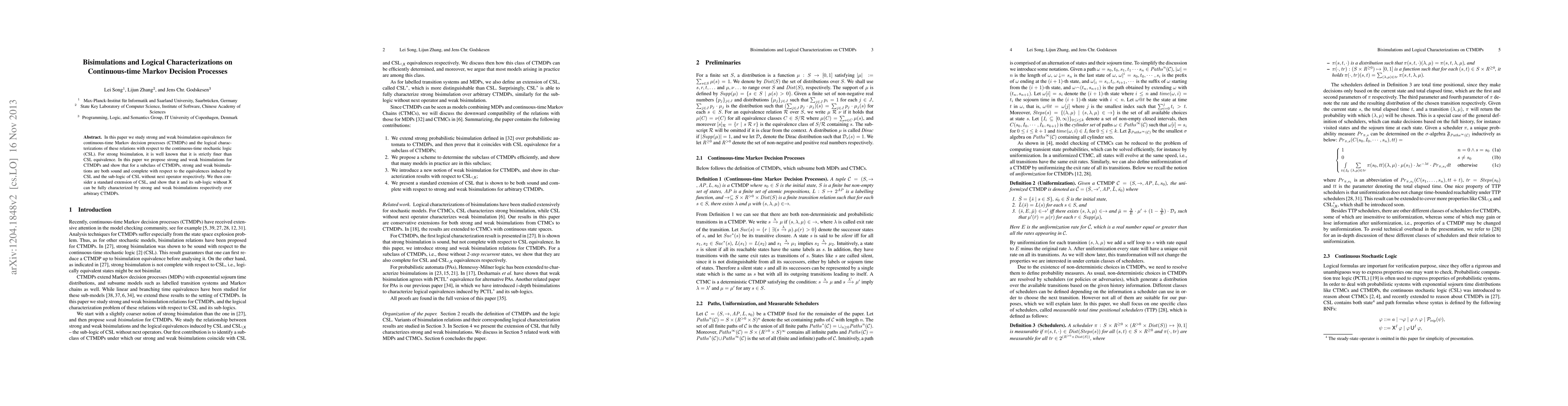 This paper investigates strong and weak bisimulations for continuous-time Markov decision processes (CTMDPs) and their logical characterizations using continuous-time stochastic logic (CSL). It demonstrates that strong and weak bisimulations are sound and complete for certain CTMDP subclasses relative to CSL and its sub-logic without the next operator.