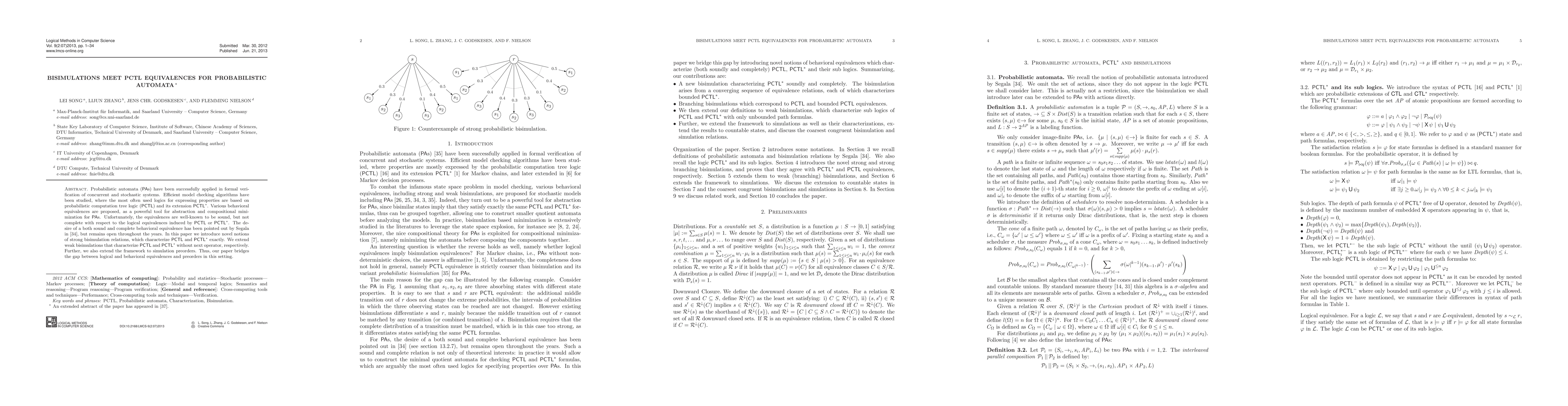 This paper introduces novel strong bisimulation relations for probabilistic automata that precisely characterize PCTL and PCTL* equivalences, addressing the longstanding open problem of finding both sound and complete behavioral equivalences in probabilistic model checking. The work extends existing bisimulation concepts and simulation preorders to bridge the gap between logical and behavioral equivalences.