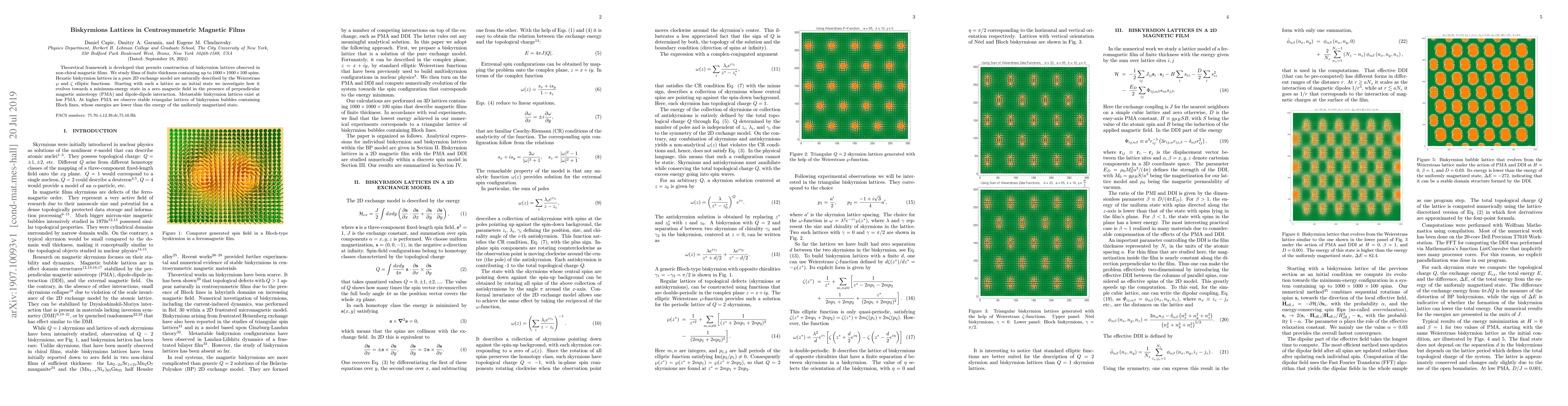 Abstract Theoretical framework is developed that explains biskyrmion lattices observed in non-chiral magnetic films. We study films of finite thickness containing up to $1000\times1000\times100$ spins. Hexatic biskyrmion lattices in a pure 2D exchange model are naturally described by the Weierstrass $\wp$ and $\zeta$ elliptic functions. Starting with such a lattice as an initial state we investigate how it evolves towards the minimum-energy state in the presence of perpendicular magnetic anisotropy and dipole-dipole interaction. In accordance with experiments, we find that the final state is a triangular lattice of biskyrmion bubbles containing Bloch lines.