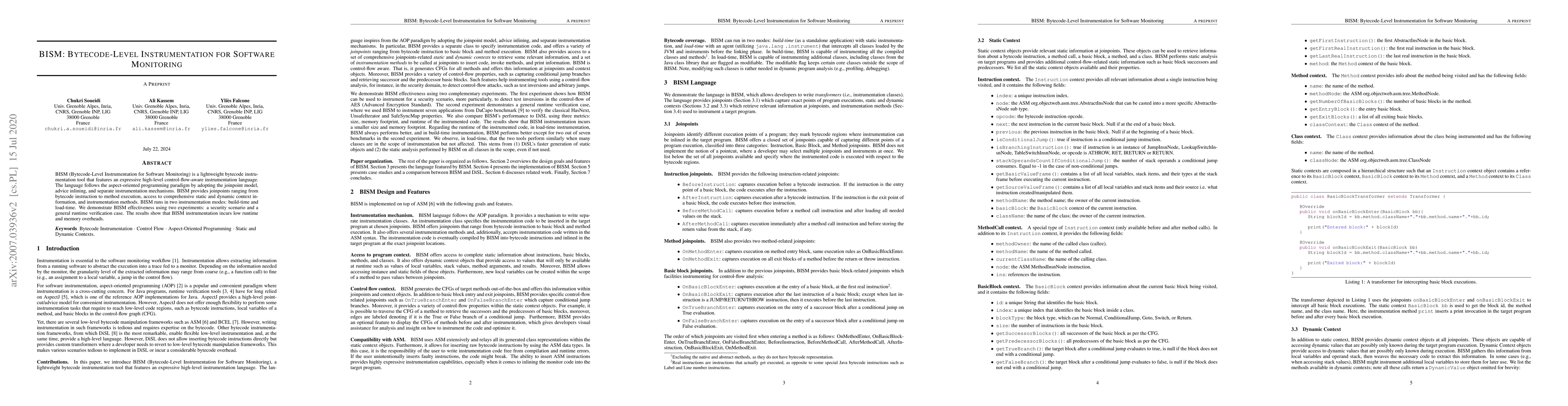 BISM is a lightweight bytecode instrumentation tool that uses an expressive, aspect-oriented language for monitoring software. It demonstrates low runtime and memory overheads in security and runtime verification experiments.