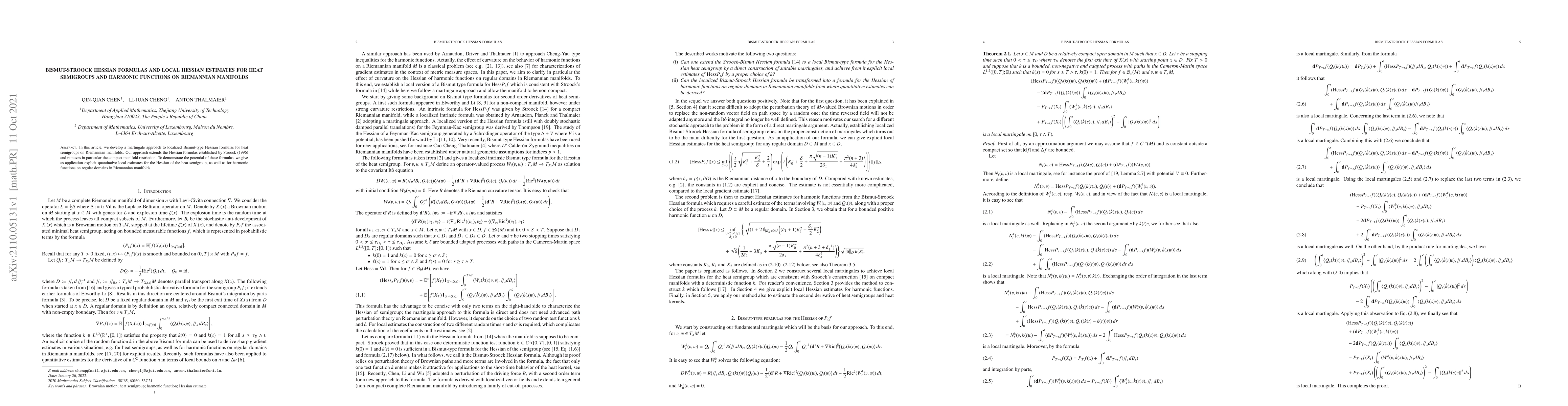 This paper develops a martingale approach to derive localized Bismut-type Hessian formulas for heat semigroups on Riemannian manifolds, extending Stroock's results and removing the compact manifold restriction. It provides explicit quantitative local Hessian estimates for heat semigroups and harmonic functions on regular domains.