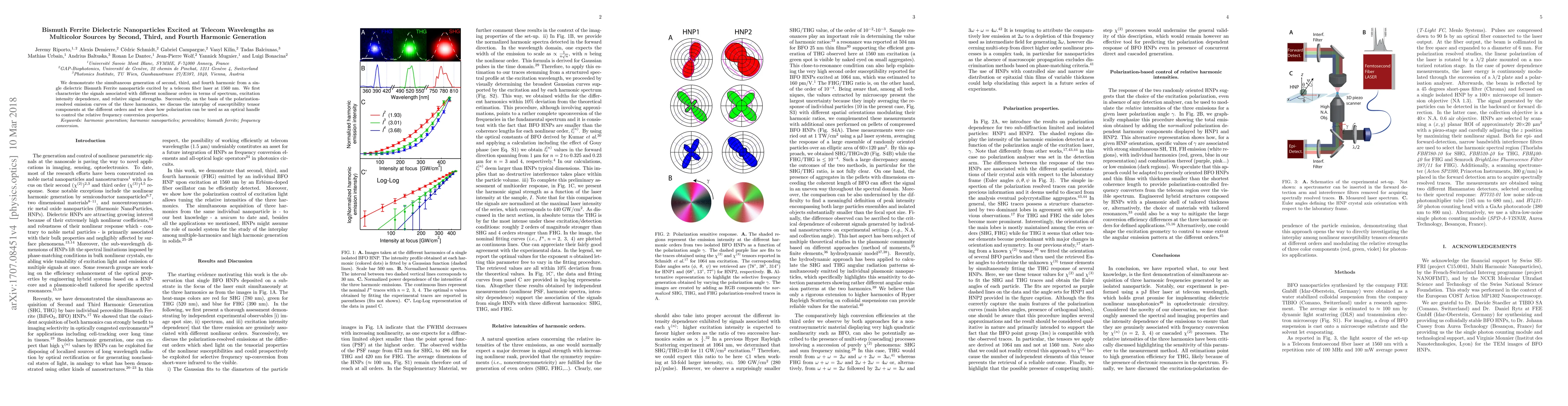 This research demonstrates the simultaneous generation of second, third, and fourth harmonics from dielectric Bismuth Ferrite nanoparticles excited by a telecom fiber laser. The study characterizes these harmonics and shows how polarization can control the relative frequency conversion properties through the interplay of susceptibility tensor components.