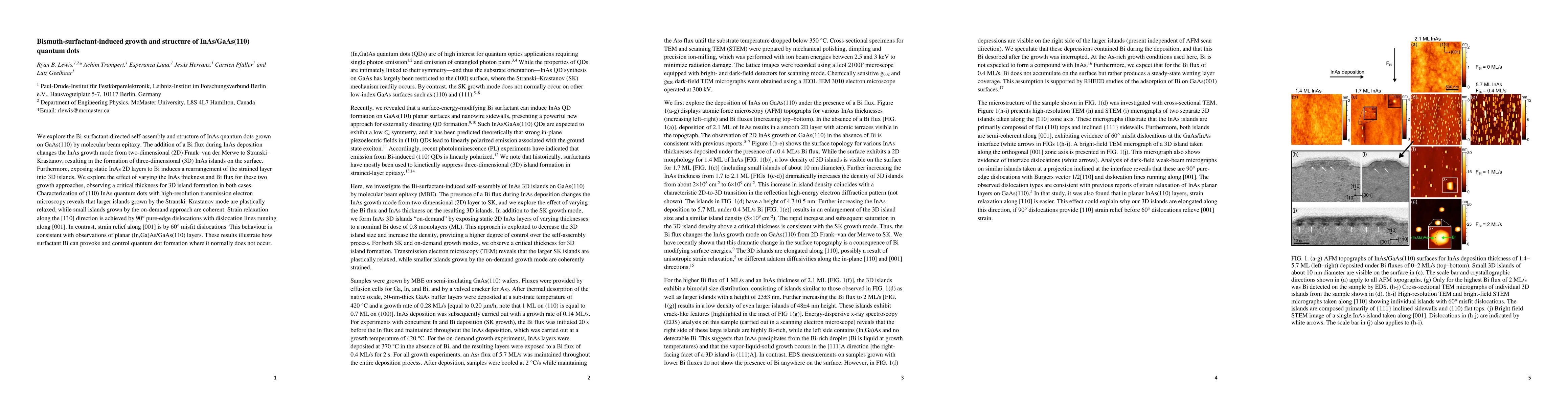 This study investigates how bismuth surfactant directs the formation of InAs quantum dots on GaAs(110) using molecular beam epitaxy, transitioning growth from 2D to 3D and inducing island rearrangement. The research highlights the role of Bi flux and InAs thickness in controlling quantum dot structure, revealing different strain relaxation mechanisms for larger and smaller islands.