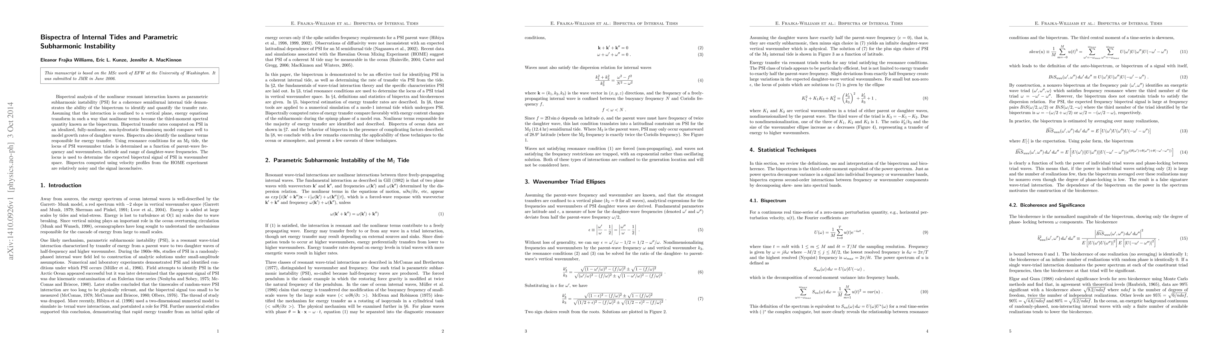 The paper demonstrates the application of bispectra and bicoherence for identifying wave-triads and quantifying energy transfer, with a specific focus on tailoring tools for PSI of coherent internal tides.