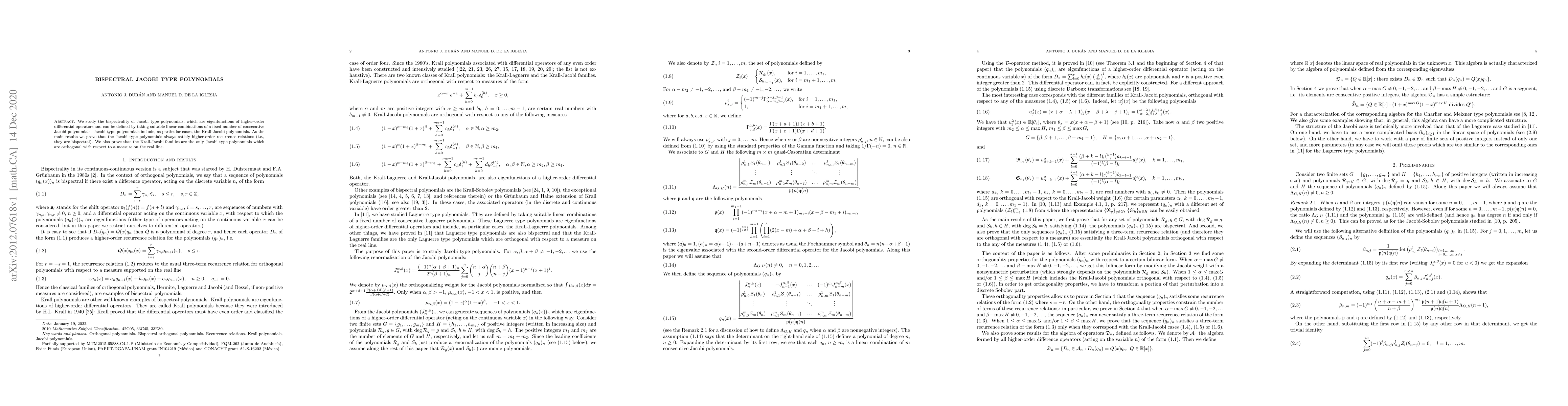 This paper investigates the bispectrality of Jacobi type polynomials, demonstrating that they satisfy higher-order recurrence relations and identifying Krall-Jacobi polynomials as the unique orthogonal Jacobi type polynomials with respect to a real line measure.