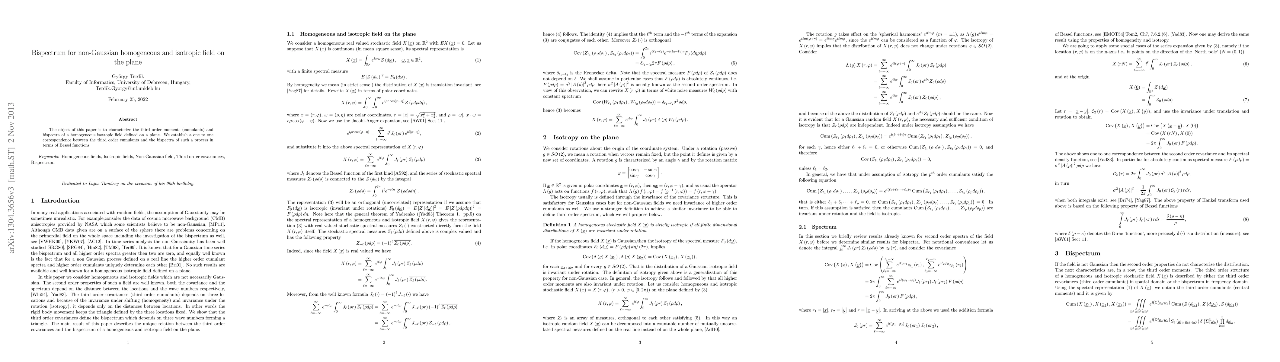 The object of this paper is to characterize the third order moments (cumulants) and bispectra of a homogeneous isotropic field defined on a plane. We establish a one to one correspondence between the third order cumulants and the bispectra of such a process in terms of Bessel functions.