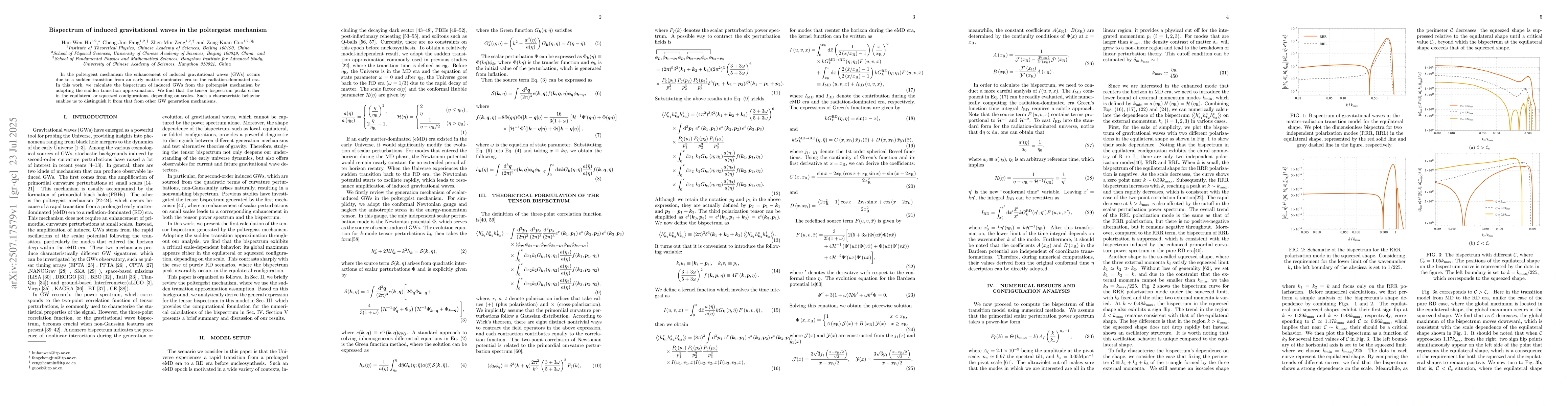 In the poltergeist mechanism the enhancement of induced gravitational waves (GWs) occurs due to a sudden transition from an early matter-dominated era to the radiation-dominated era. In this work, we calculate the bispectrum of induced GWs from the poltergeist mechanism by adopting the sudden transition approximation. We find that the tensor bispectrum peaks either in the equilateral or squeezed configurations, depending on scales. Such a characteristic behavior enables us to distinguish it from that from other GW generation mechanisms.