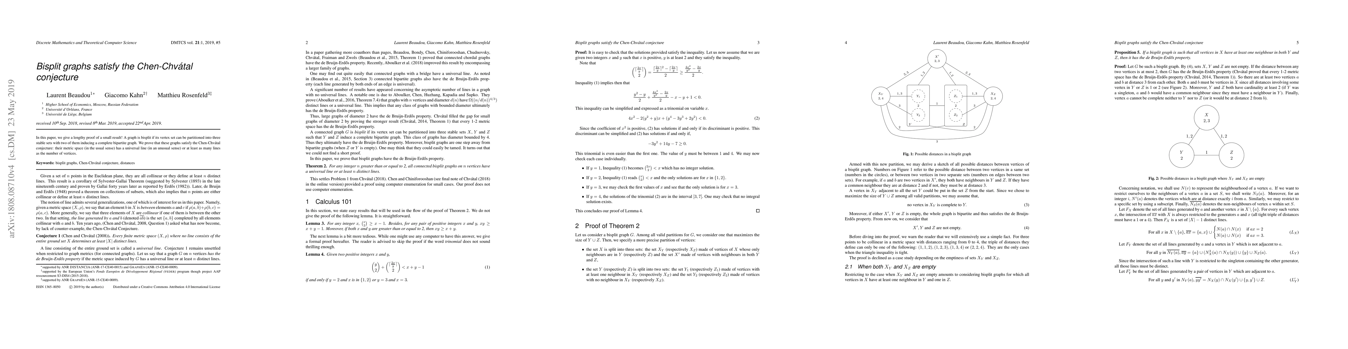In this paper, we give a lengthy proof of a small result! A graph is bisplit if its vertex set can be partitioned into three stable sets with two of them inducing a complete bipartite graph. We prove that these graphs satisfy the Chen-Chv\'atal conjecture: their metric space (in the usual sense) has a universal line (in an unusual sense) or at least as many lines as the number of vertices.