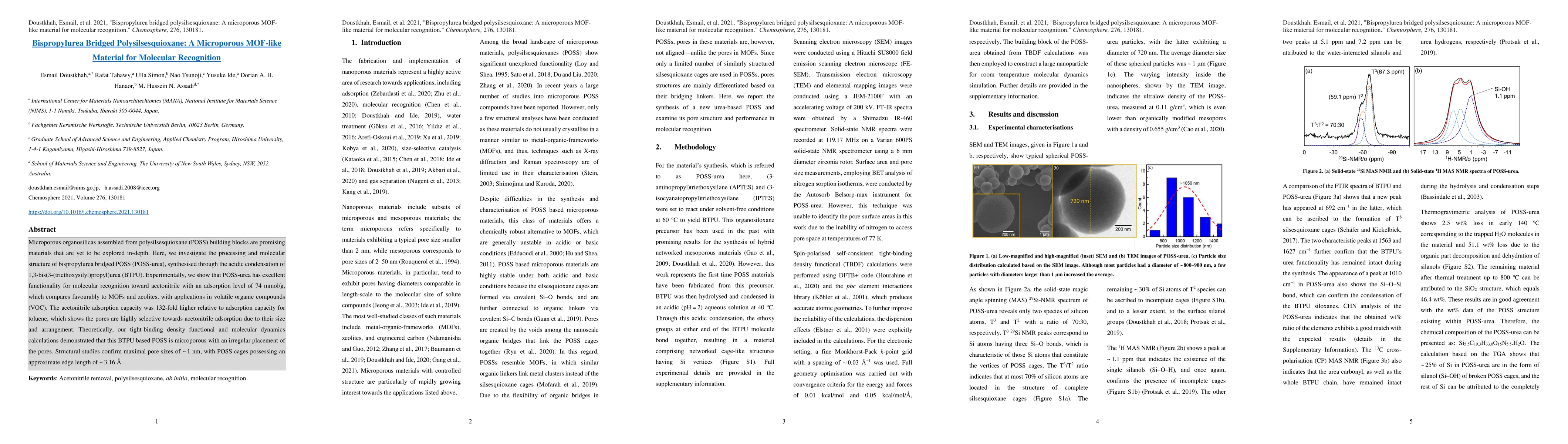 Microporous organosilicas assembled from polysilsesquioxane (POSS) building blocks are promising materials that are yet to be explored in-depth. Here, we investigate the processing and molecular structure of bispropylurea bridged POSS (POSS-urea), synthesised through the acidic condensation of 1,3-bis(3-(triethoxysilyl)propyl)urea (BTPU). Experimentally, we show that POSS-urea has excellent functionality for molecular recognition toward acetonitrile with an adsorption level of 74 mmol/g, which compares favourably to MOFs and zeolites, with applications in volatile organic compounds (VOC). The acetonitrile adsorption capacity was 132-fold higher relative to adsorption capacity for toluene, which shows the pores are highly selective towards acetonitrile adsorption due to their size and arrangement. Theoretically, our tight-binding density functional and molecular dynamics calculations demonstrated that this BTPU based POSS is microporous with an irregular placement of the pores. Structural studies confirm maximal pore sizes of around 1 nm, with POSS cages possessing an approximate edge length of approximately 3.16 Angstrom