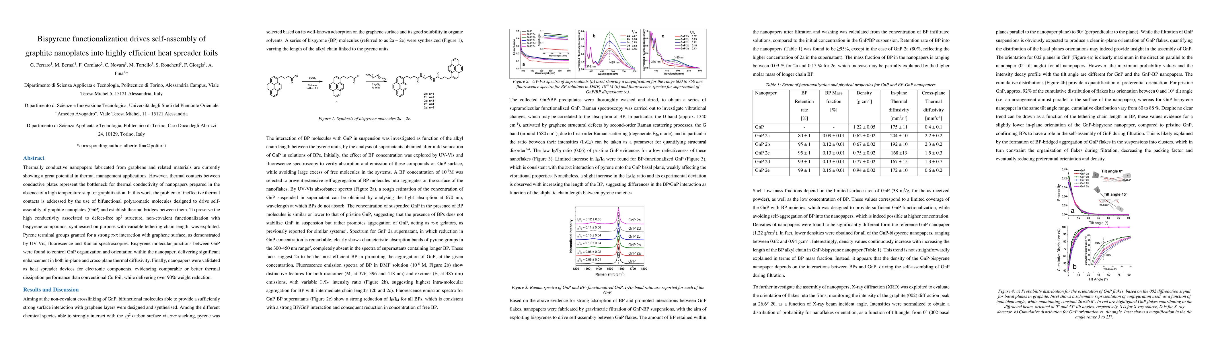 Thermally conductive nanopapers fabricated from graphene and related materials are currently showing a great potential in thermal management applications. However, thermal contacts between conductive plates represent the bottleneck for thermal conductivity of nanopapers prepared in the absence of a high temperature step for graphitization. In this work, the problem of ineffective thermal contacts is addressed by the use of bifunctional polyaromatic molecules designed to drive self-assembly of graphite nanoplates (GnP) and establish thermal bridges between them. To preserve the high conductivity associated to defect-free sp2 structure, non-covalent functionalization with bispyrene compounds, synthesised on purpose with variable tethering chain length, was exploited. Pyrene terminal groups granted for a strong {\pi}-{\pi} interaction with graphene surface, as demonstrated by UV-Vis, fluorescence and Raman spectroscopies. Bispyrene molecular junctions between GnP were found to control GnP organization and orientation within the nanopaper, delivering significant enhancement in both in-plane and cross-plane thermal diffusivity. Finally, nanopapers were validated as heat spreader devices for electronic components, evidencing comparable or better thermal dissipation performance than conventional Cu foil, while delivering over 90% weight reduction.