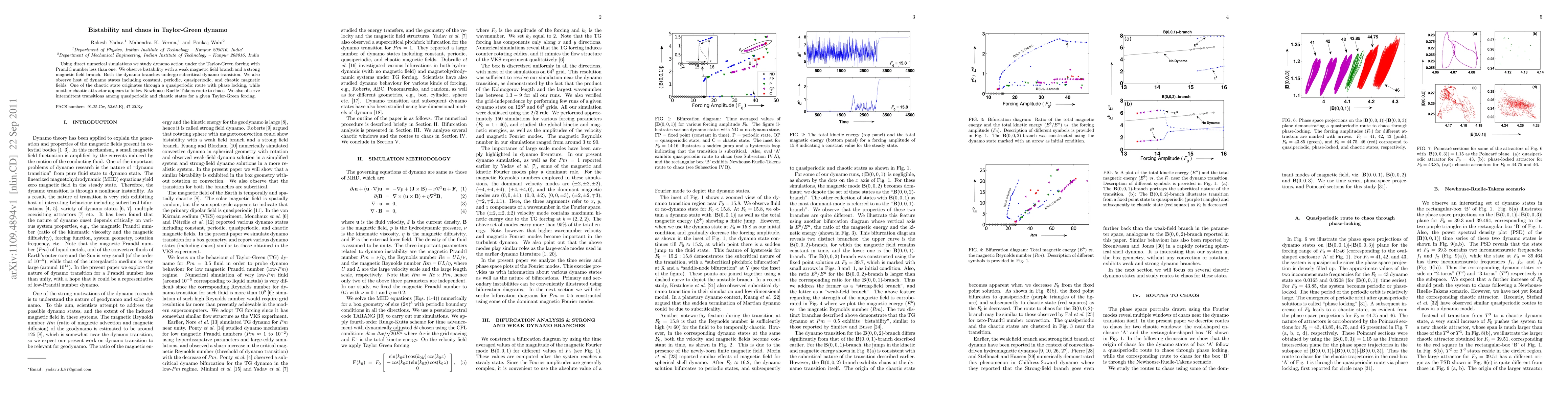 This study employs direct numerical simulations to explore dynamo action driven by Taylor-Green forcing, revealing bistability with distinct weak and strong magnetic field branches. It observes a variety of magnetic states, including chaotic dynamics emerging via quasiperiodic routes and Newhouse-Ruelle-Takens mechanisms, alongside intermittent transitions between these states.