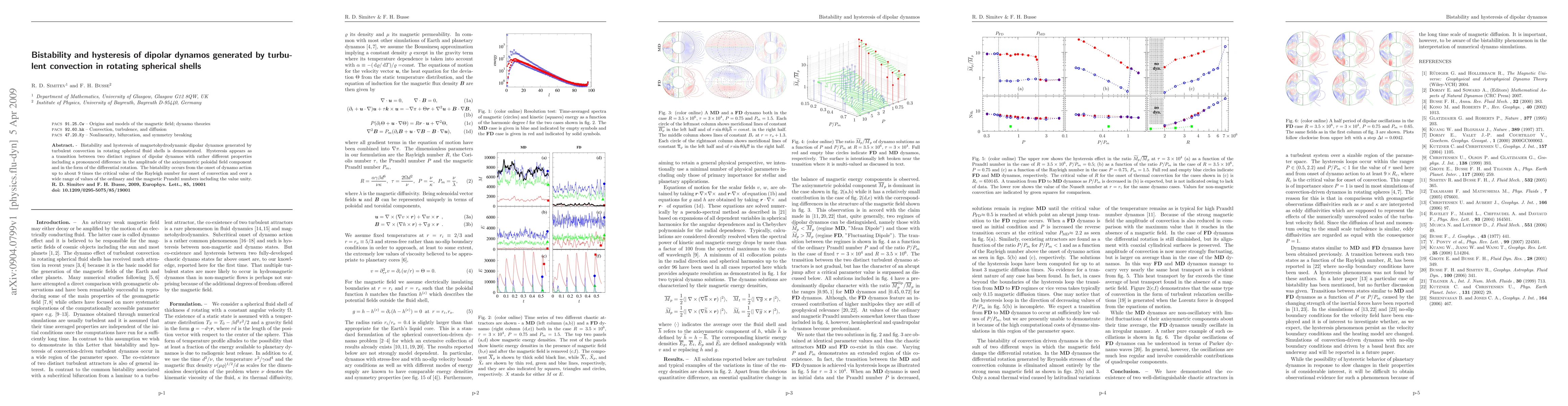 This paper demonstrates bistability and hysteresis in dipolar dynamos driven by turbulent convection in rotating spherical shells, showing transitions between two distinct dynamo regimes with differing properties, including amplitude and differential rotation, over a broad range of Rayleigh and Prandtl numbers.