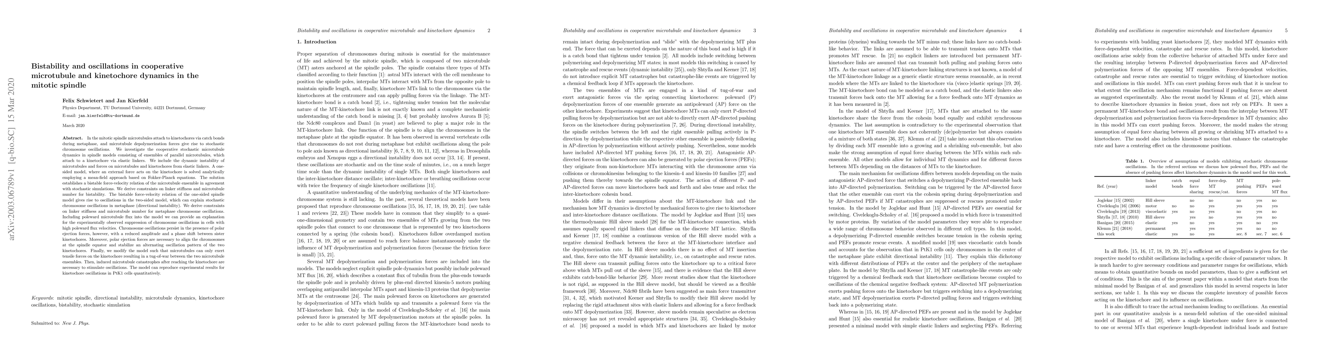 This paper investigates the cooperative dynamics of microtubules and kinetochores in the mitotic spindle, revealing bistability and oscillations through stochastic simulations and analytical models. It establishes a bistable force-velocity relationship and provides constraints on linker stiffness and microtubule number to explain chromosome oscillations and their suppression in high flux conditions.