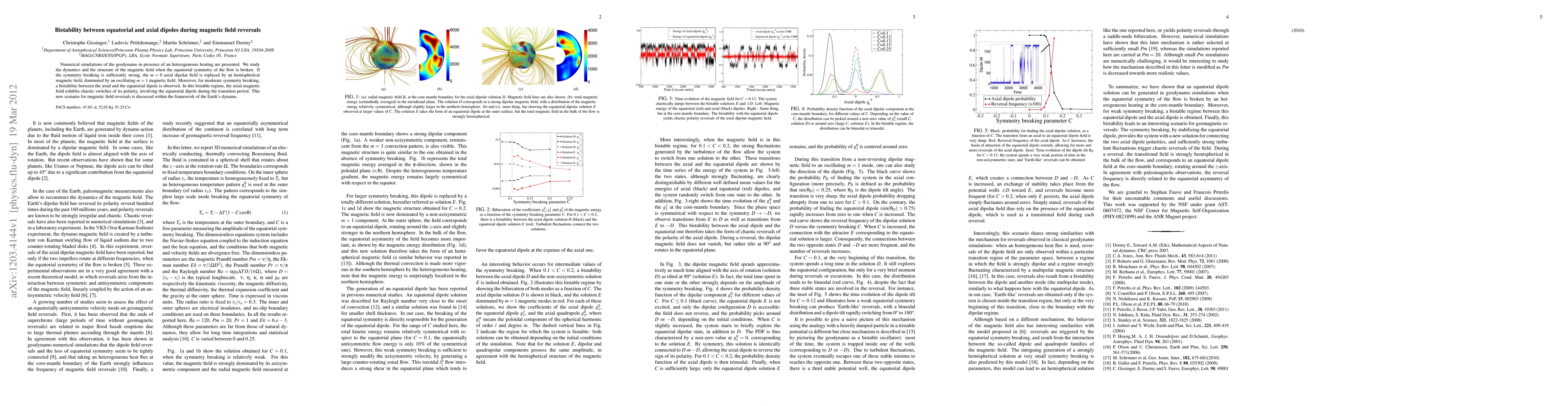 Numerical simulations of the geodynamo in presence of an heterogeneous heating are presented. We study the dynamics and the structure of the magnetic field when the equatorial symmetry of the flow is broken. If the symmetry breaking is sufficiently strong, the m = 0 axial dipolar field is replaced by an hemispherical magnetic field, dominated by an oscillating m = 1 magnetic field. Moreover, for moderate symmetry breaking, a bistability between the axial and the equatorial dipole is observed. In this bistable regime, the axial magnetic field exhibits chaotic switches of its polarity, involving the equatorial dipole during the transition period. This new scenario for magnetic field reversals is discussed within the framework of the Earth's dynamo.