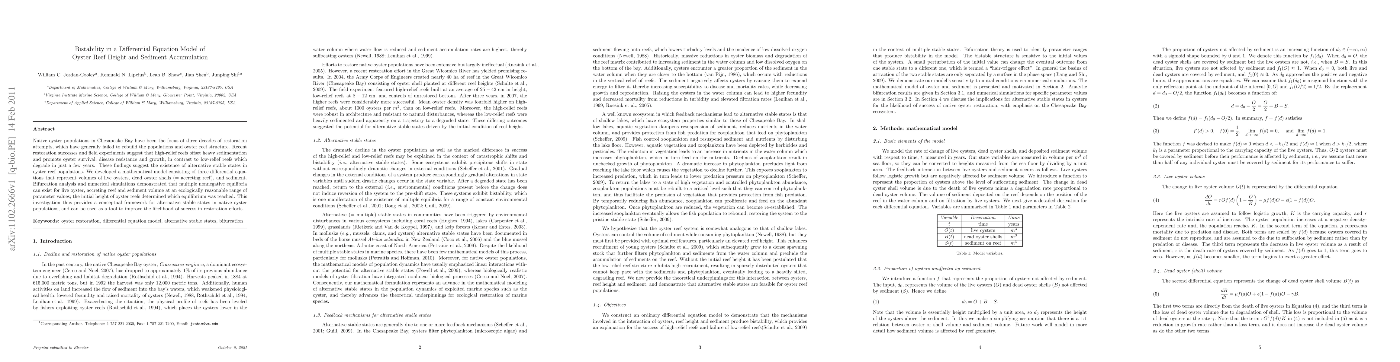 The development of a differential equation model that elucidates the bistability in oyster reef height and sediment accumulation, providing insights into alternative stable states in oyster populations.