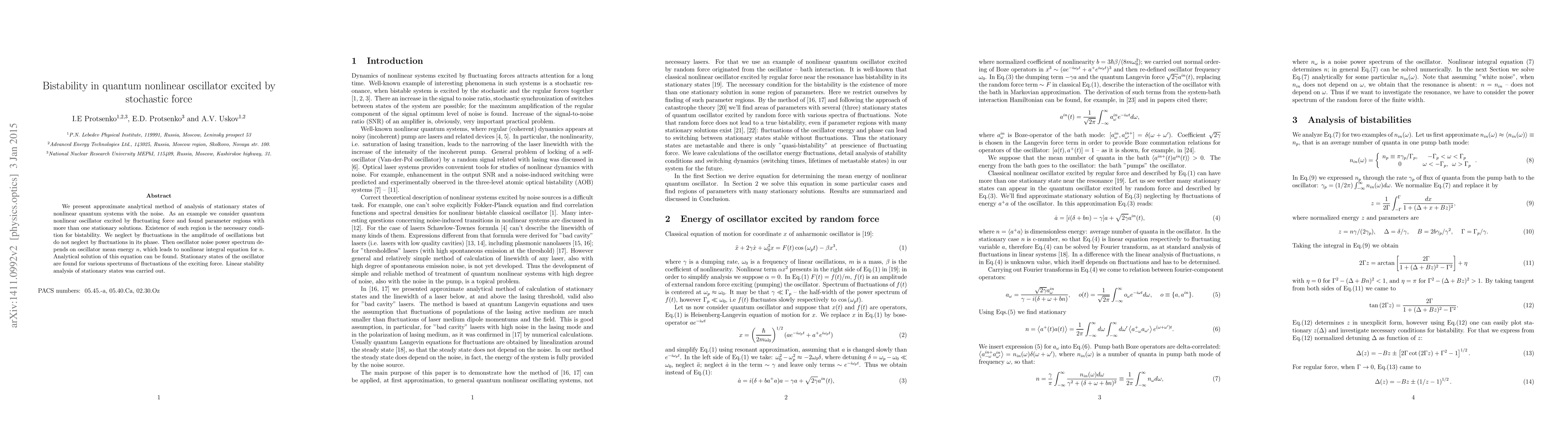 We present approximate analytical method of analysis of stationary states of nonlinear quantum systems with the noise. As an example we consider quantum nonlinear oscillator excited by fluctuating force and found parameter regions with more than one stationary solutions. Existence of such region is the necessary condition for bistability. We neglect by fluctuations in the amplitude of oscillations but do not neglect by fluctuations in its phase. Then oscillator noise power spectrum depends on oscillator mean energy n, which leads to nonlinear integral equation for n. Analytical solution of this equation can be found. Stationary states of the oscillator are found for various spectrums of fluctuations of the exciting force. Linear stability analysis of stationary states was carried out.