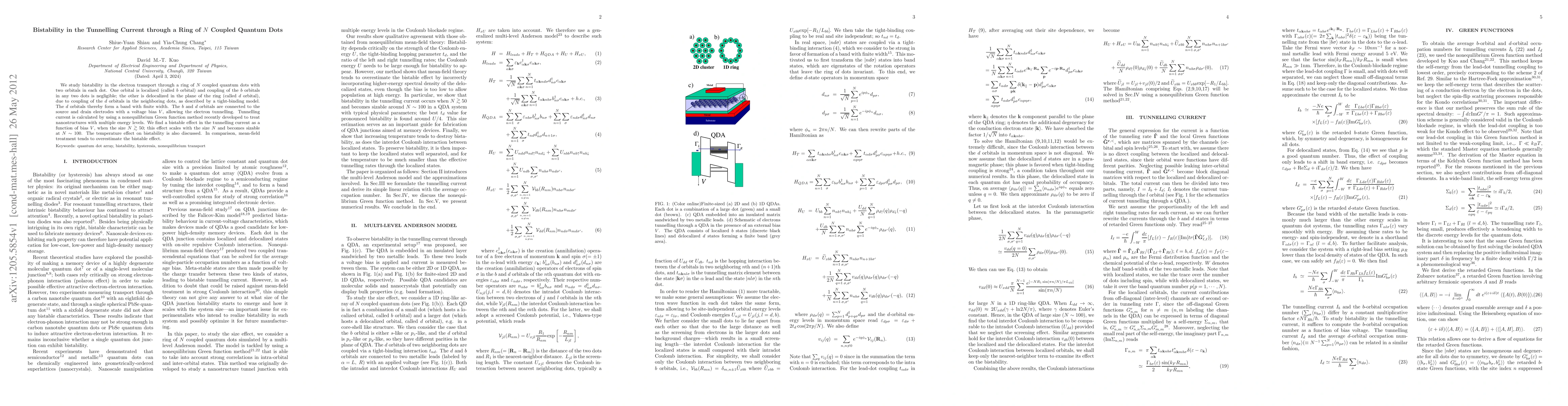 We study bistability in the electron transport through a ring of N coupled quantum dots with two orbitals in each dot. One orbital is localized (called b orbital) and coupling of the b orbitals in any two dots is negligible; the other is delocalized in the plane of the ring (called d orbital), due to coupling of the d orbitals in the neighboring dots, as described by a tight-binding model. The d orbitals thereby form a band with finite width. The b and d orbitals are connected to the source and drain electrodes with a voltage bias V, allowing the electron tunnelling. Tunnelling current is calculated by using a nonequilibrium Green function method recently developed to treat nanostructures with multiple energy levels. We find a bistable effect in the tunnelling current as a function of bias V, when the size N>50; this effect scales with the size N and becomes sizable at N~100. The temperature effect on bistability is also discussed. In comparison, mean-field treatment tends to overestimate the bistable effect.