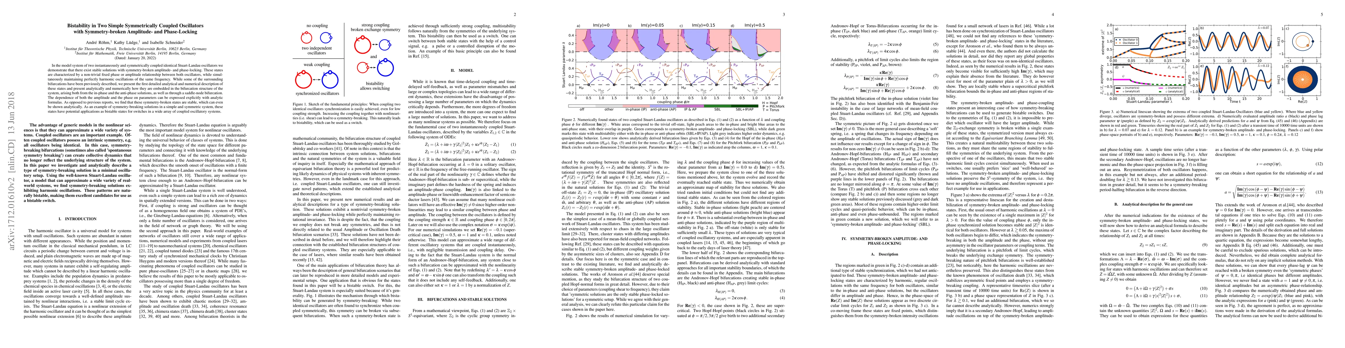 This paper investigates bistability in two symmetrically coupled Stuart-Landau oscillators, revealing stable states with broken amplitude and phase-locking. These states, characterized by a fixed phase and amplitude relationship, arise from bifurcations and are shown to be stable, offering potential applications in oscillatory system switches.